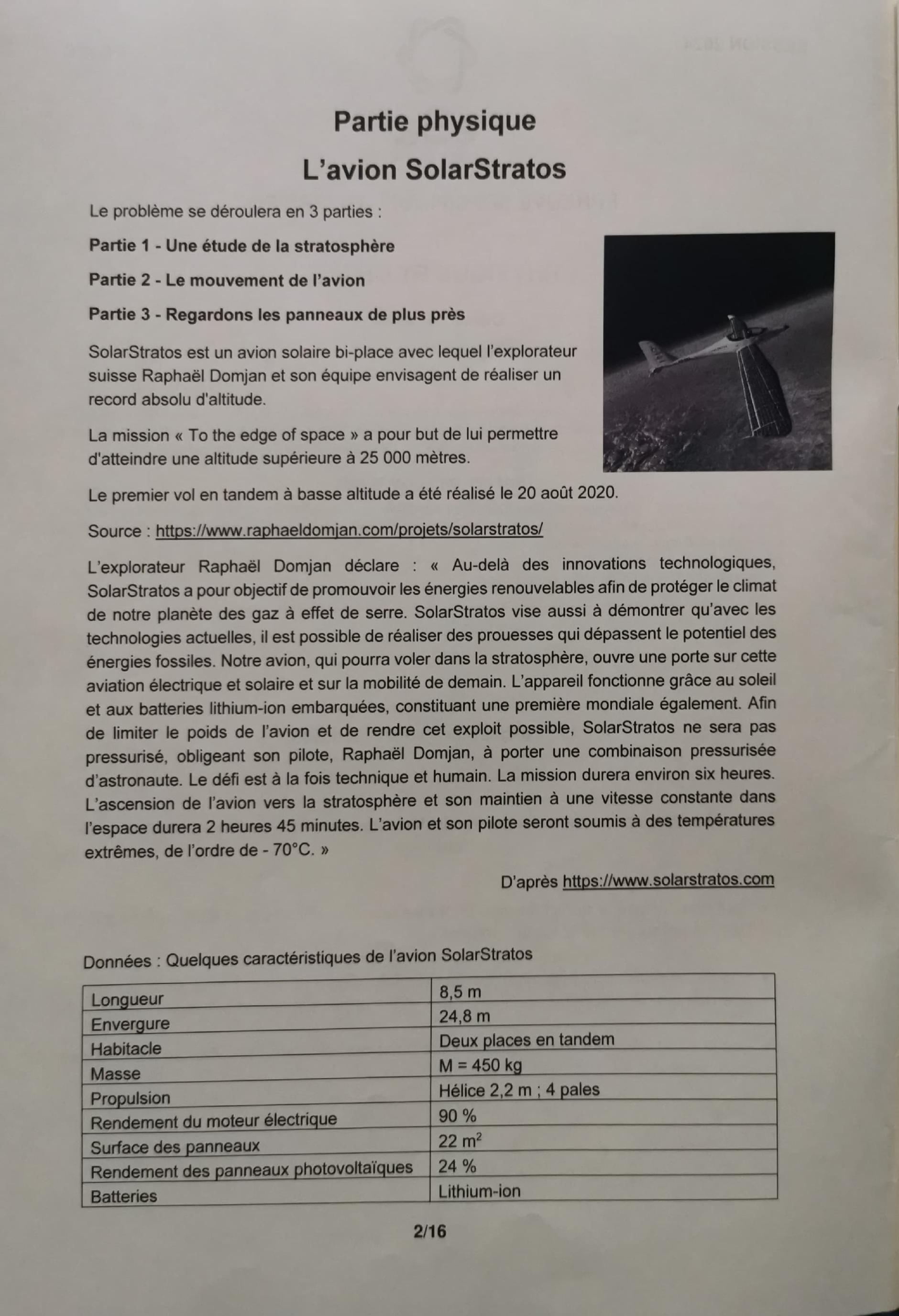 Q12. De quelle puissance électrique l'avion doit-il ainsi disposer pendant cette phase de vol? Sachant que la puissance surfacique lumineuse reçue dans la stratosphère est de l'ordre de , de quelle surface minimale de panneaux photovoltaiques l'avion doit-il disposer? Commenter.