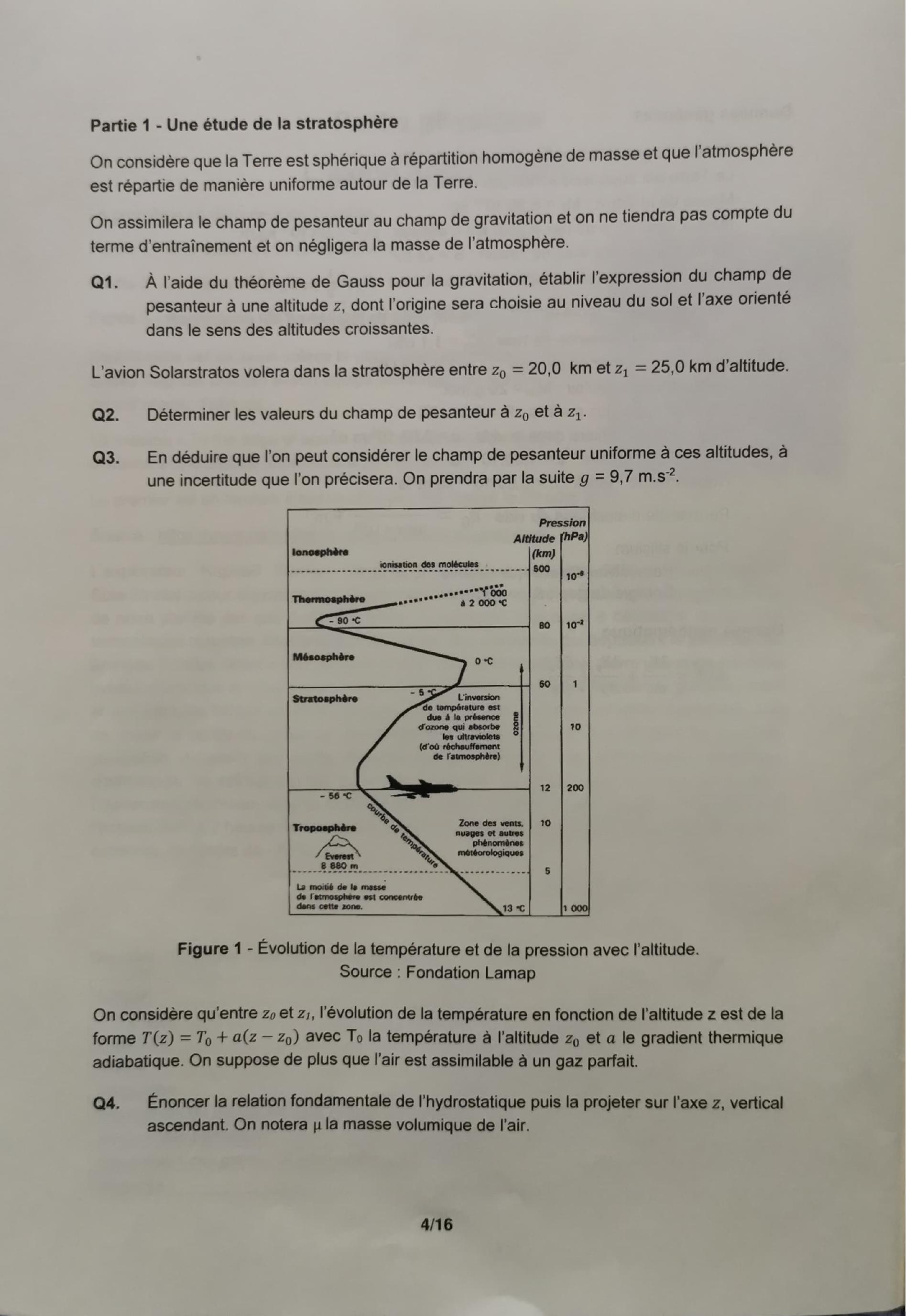 On considère qu'entre et , l'évolution de la température en fonction de l'altitude est de la forme avec la température à l'altitude et le gradient thermique adiabatique. On suppose de plus que l'air est assimilable à un gaz parfait.