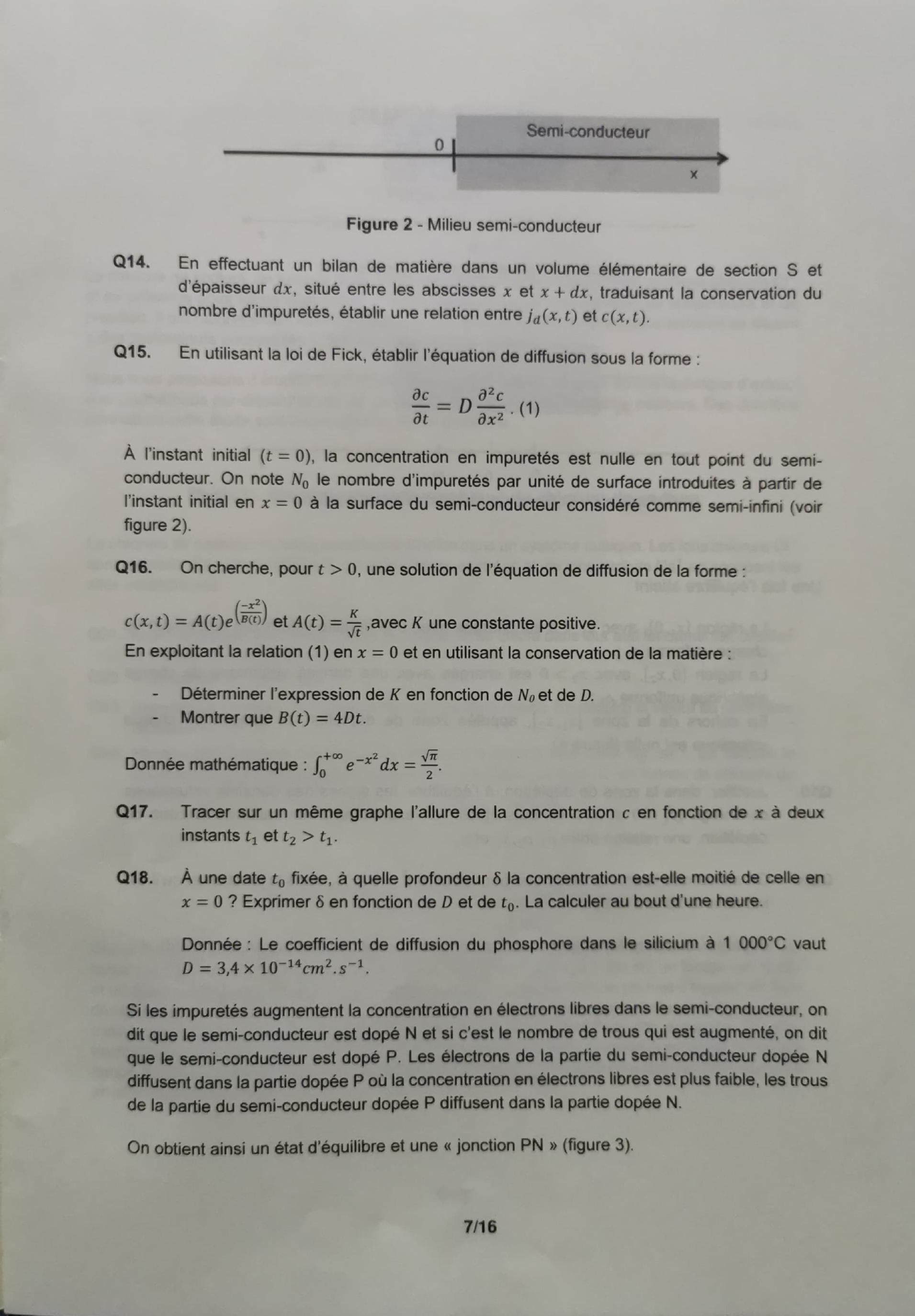 Q16. On cherche, pour , une solution de l'équation de diffusion de la forme : et , avec une constante positive.