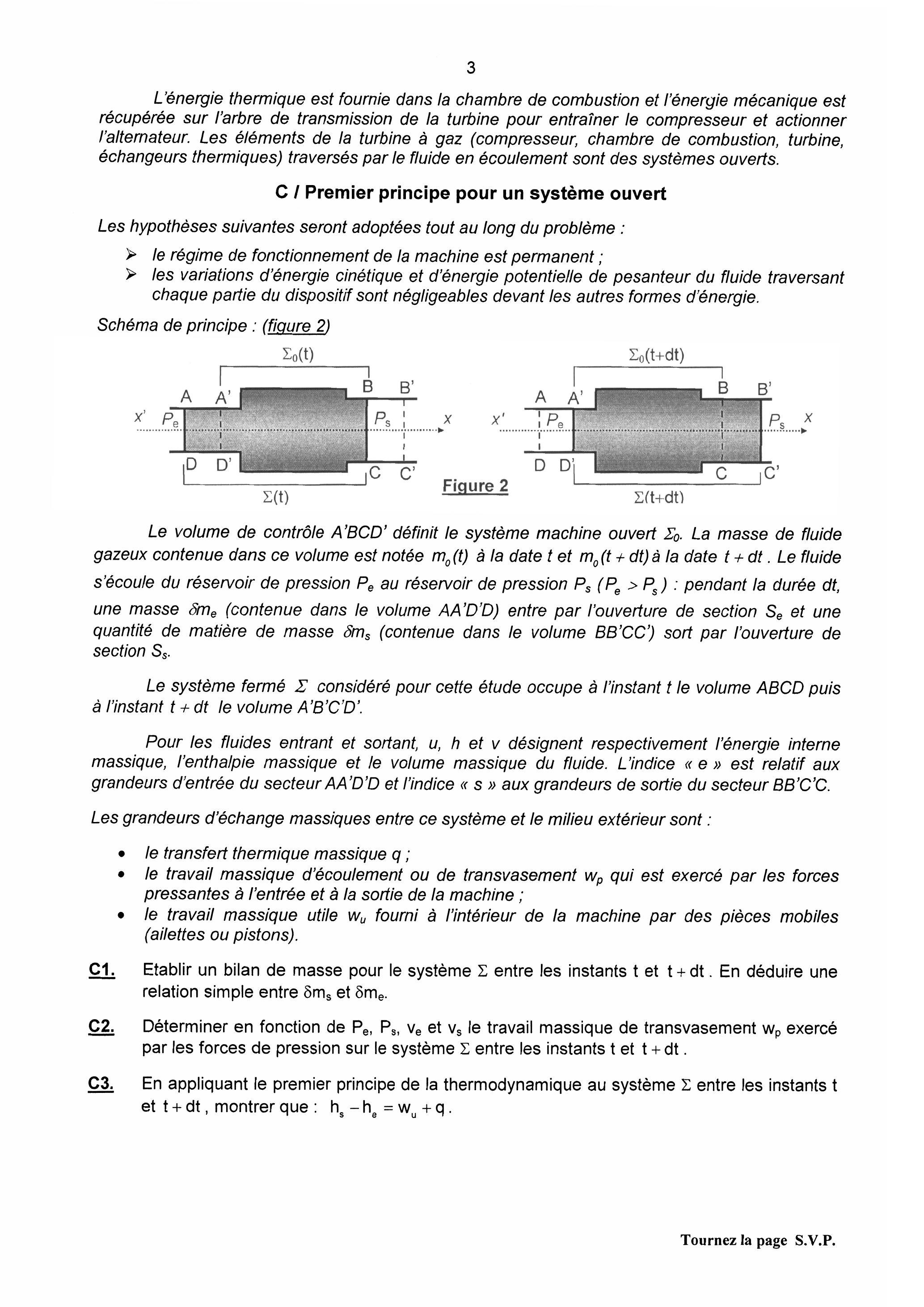 L'énergie thermique est fournie dans la chambre de combustion et l'énergie mécanique est récupérée sur l'arbre de transmission de la turbine pour entraîner le compresseur et actionner l'alternateur. Les éléments de la turbine à gaz (compresseur, chambre de combustion, turbine, échangeurs thermiques) traversés par le fluide en écoulement sont des systèmes ouverts.