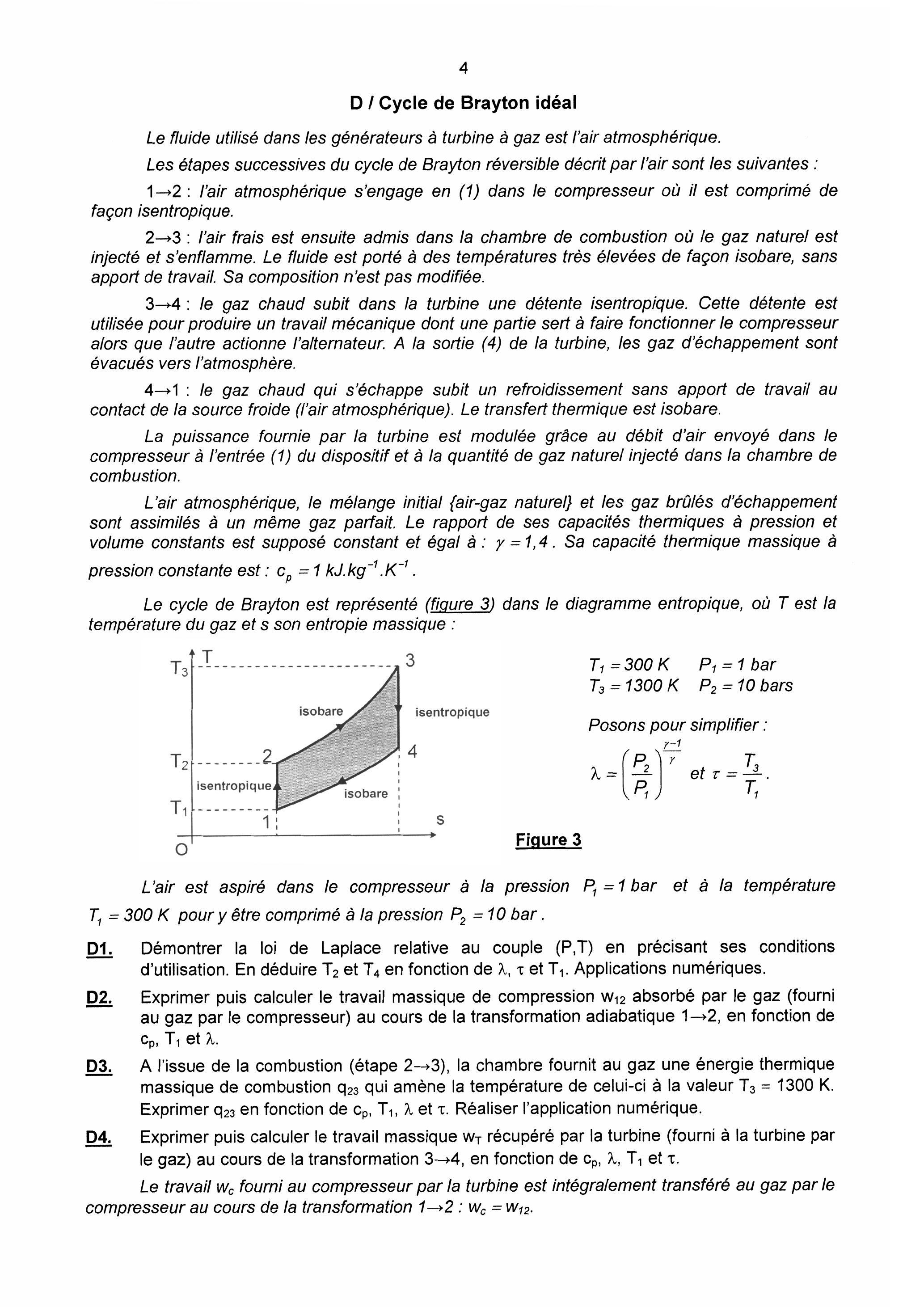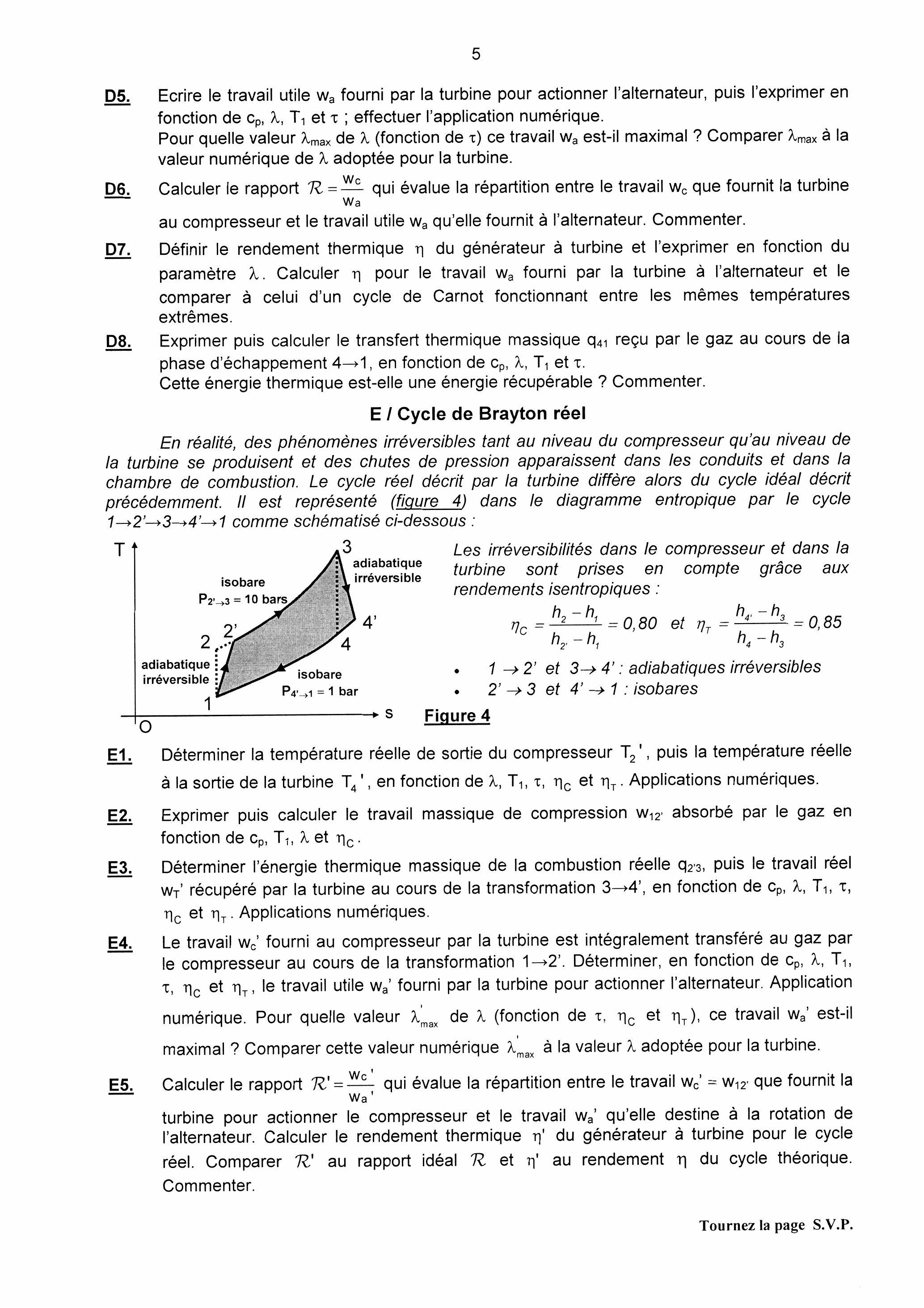 D7. Définir le rendement thermique du générateur à turbine et l'exprimer en fonction du paramètre . Calculer pour le travail fourni par la turbine à l'alternateur et le comparer à celui d'un cycle de Carnot fonctionnant entre les mêmes températures extrêmes.