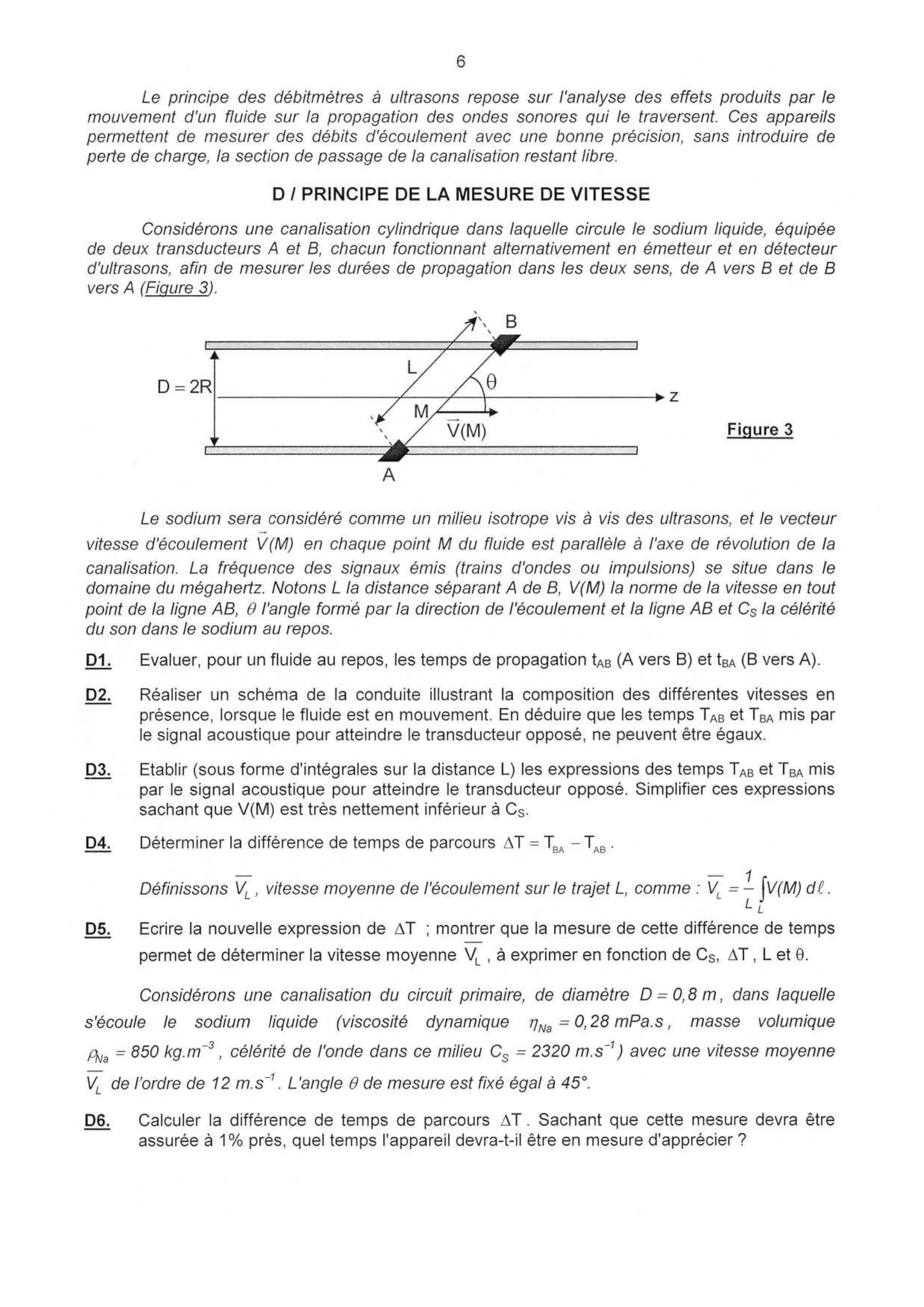 Ce problème illustre le fonctionnement du circuit de refroidissement d'un réacteur nucléaire à neutrons rapides et comporte trois volets indépendants: l'étude de l'échangeur thermique entre les deux circuits de sodium liquide (première partie), la détermination du débit de sodium par débitmétrie ultrasonore (seconde partie) et quelques aspects de la chimie du sodium - production, réactivité - (troisième partie).