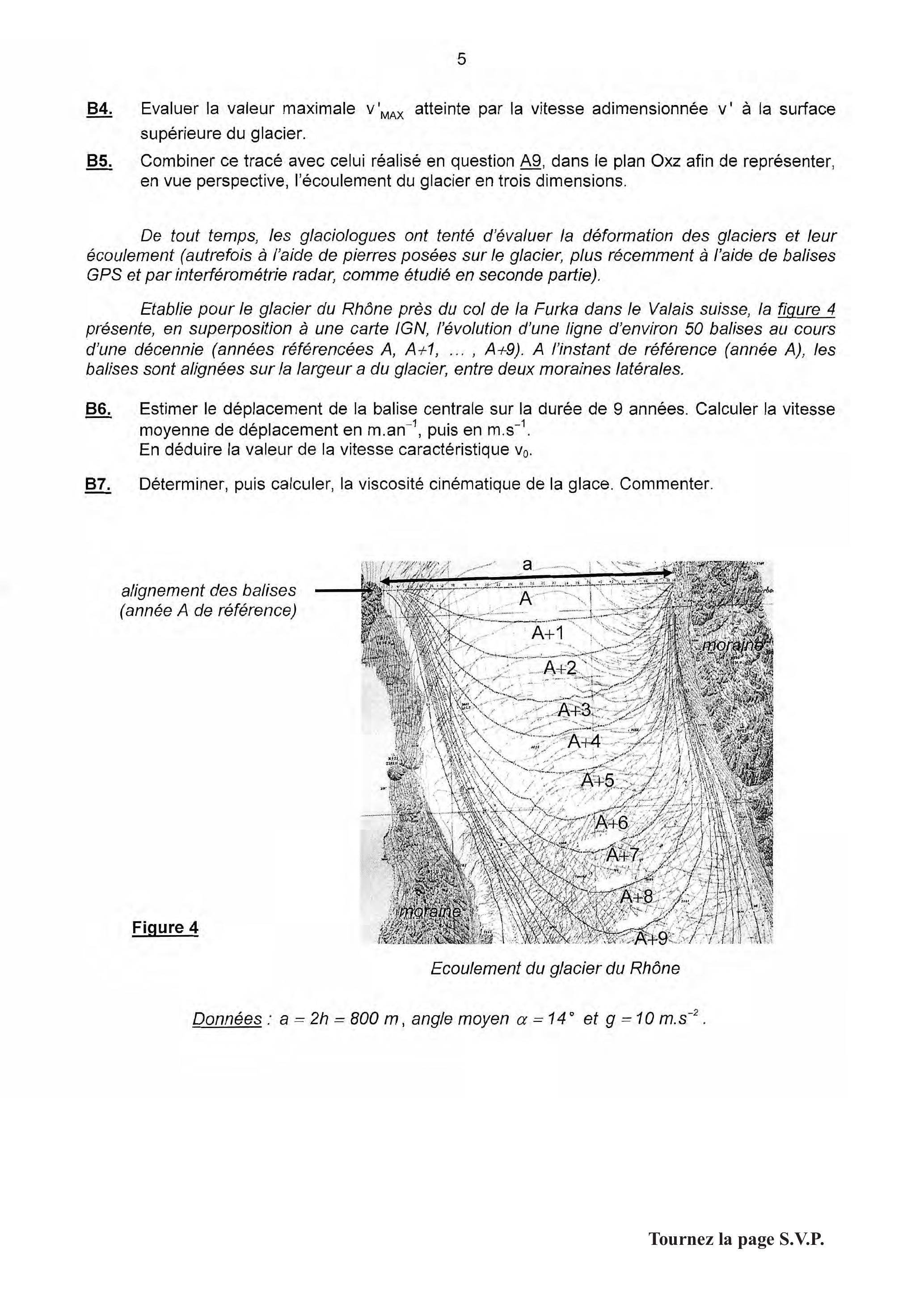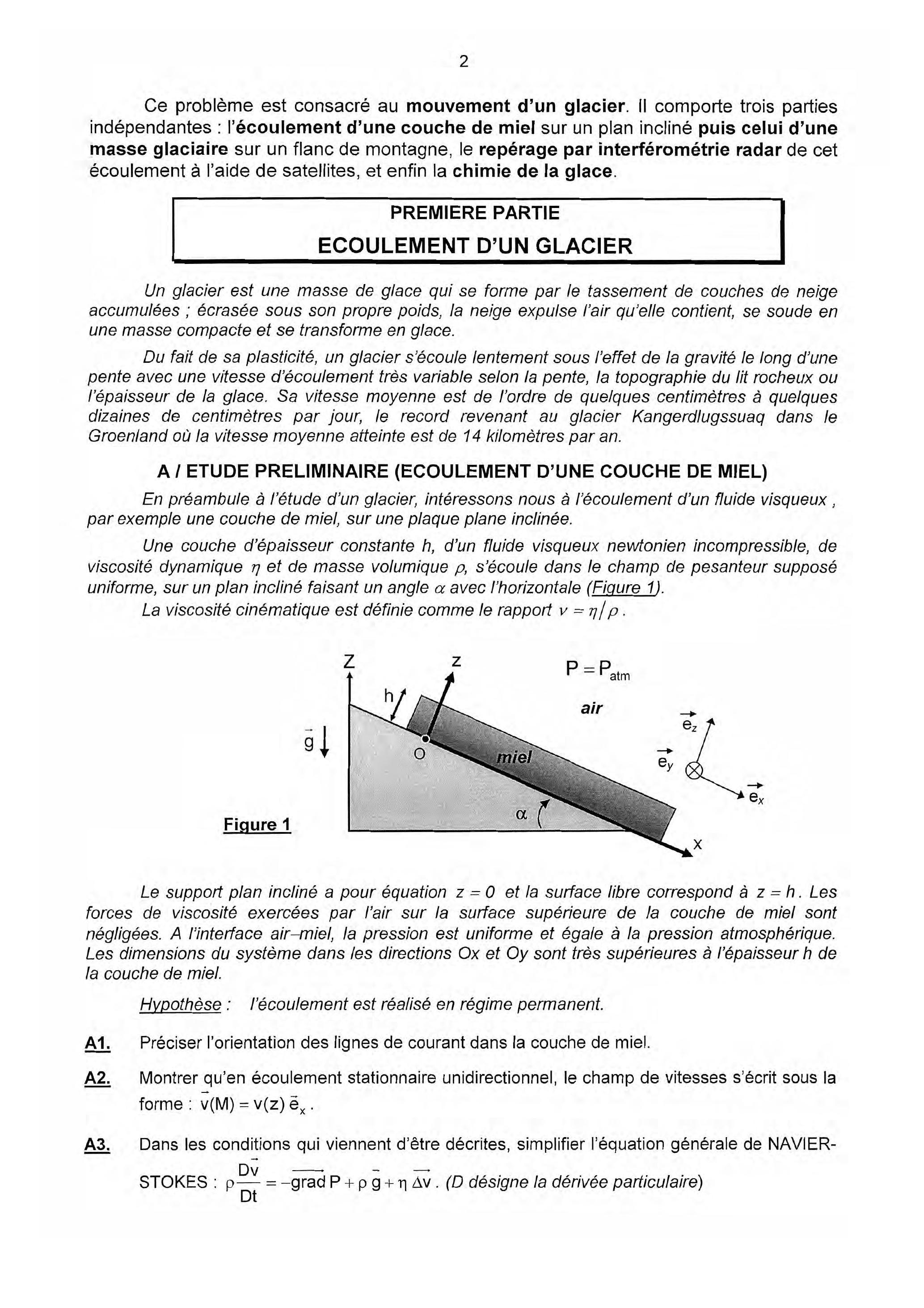 Ce problème est consacré au mouvement d'un glacier. Il comporte trois parties indépendantes : l'écoulement d'une couche de miel sur un plan incliné puis celui d'une masse glaciaire sur un flanc de montagne, le repérage par interférométrie radar de cet écoulement à l'aide de satellites, et enfin la chimie de la glace.