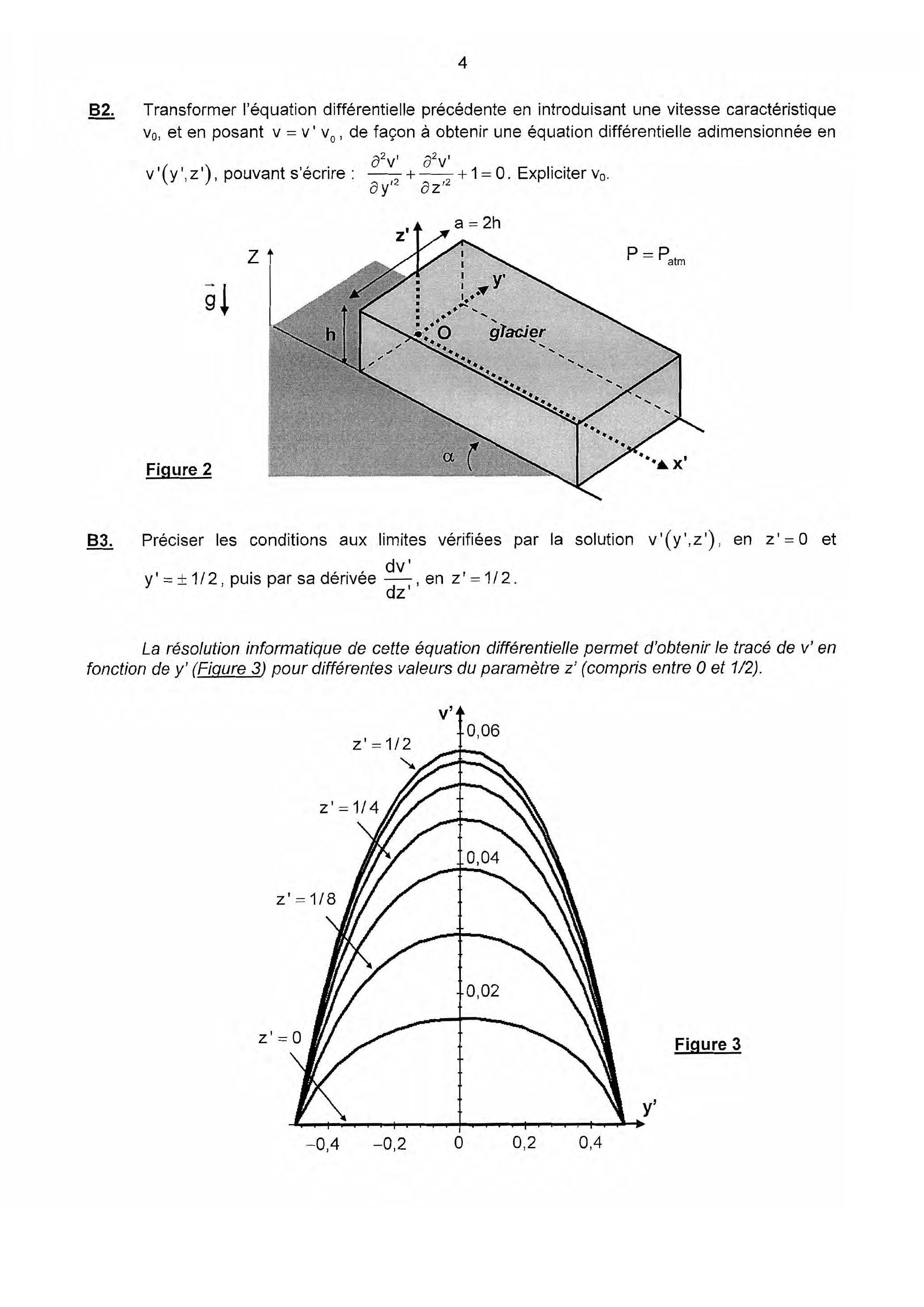 B4. Evaluer la valeur maximale atteinte par la vitesse adimensionnée ' à la surface supérieure du glacier.