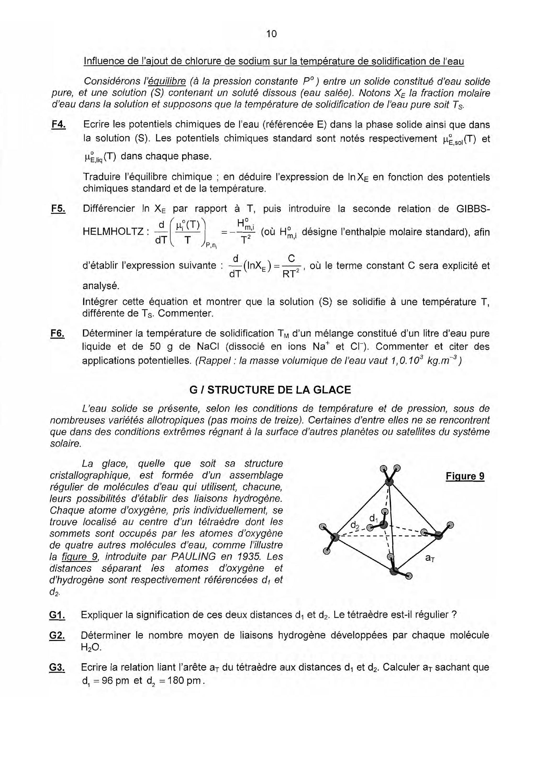 F6. Déterminer la température de solidification d'un mélange constitué d'un litre d'eau pure liquide et de 50 g de NaCl (dissocié en ions et ). Commenter et citer des applications potentielles. (Rappel : la masse volumique de l'eau vaut )