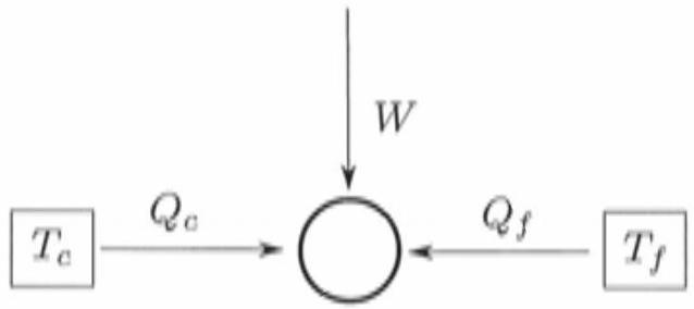 On considère un moteur ditherme fonctionnant entre une source chaude de température et une source froide de température . On note respectivement et les transferts thermiques associés et le travail reçu sur un cycle. Ces quantités sont algébriques, comme représenté sur la figure 1.