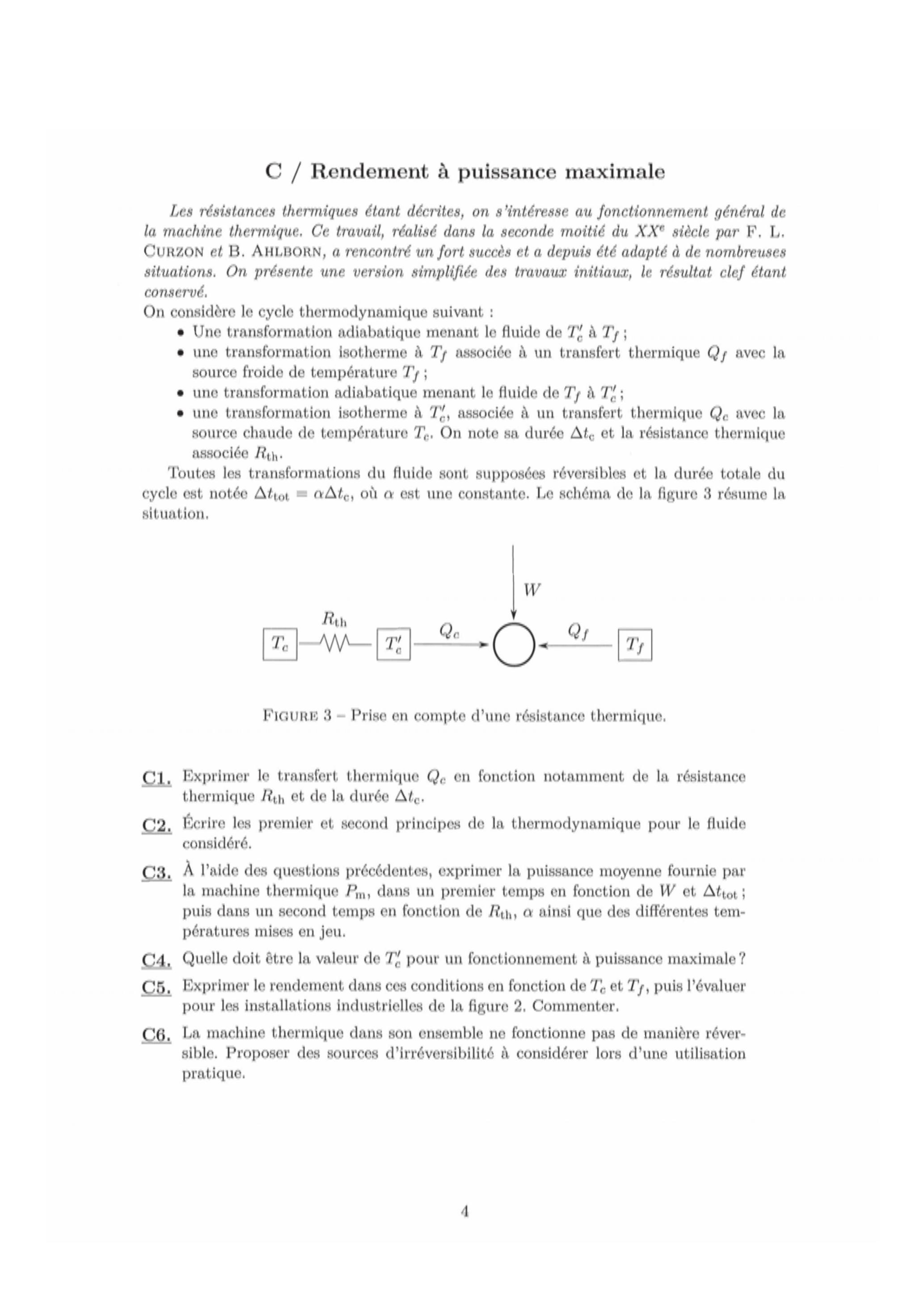 Le cycle précédent présente un rendement optimal, le rendement de Carnot. Cependant, la propriété principale d'un moteur n'est pas son rendement, mais sa puissance maximale : pour cela, on diminue volontairement la température associée au contact avec la source chaude de à . Se plaçant dans le cas pratique d'un fluide caloporteur circulant dans une conduite cylindrique en contact avec la source chaude, on étudie les transferts thermiques mis en jeu.