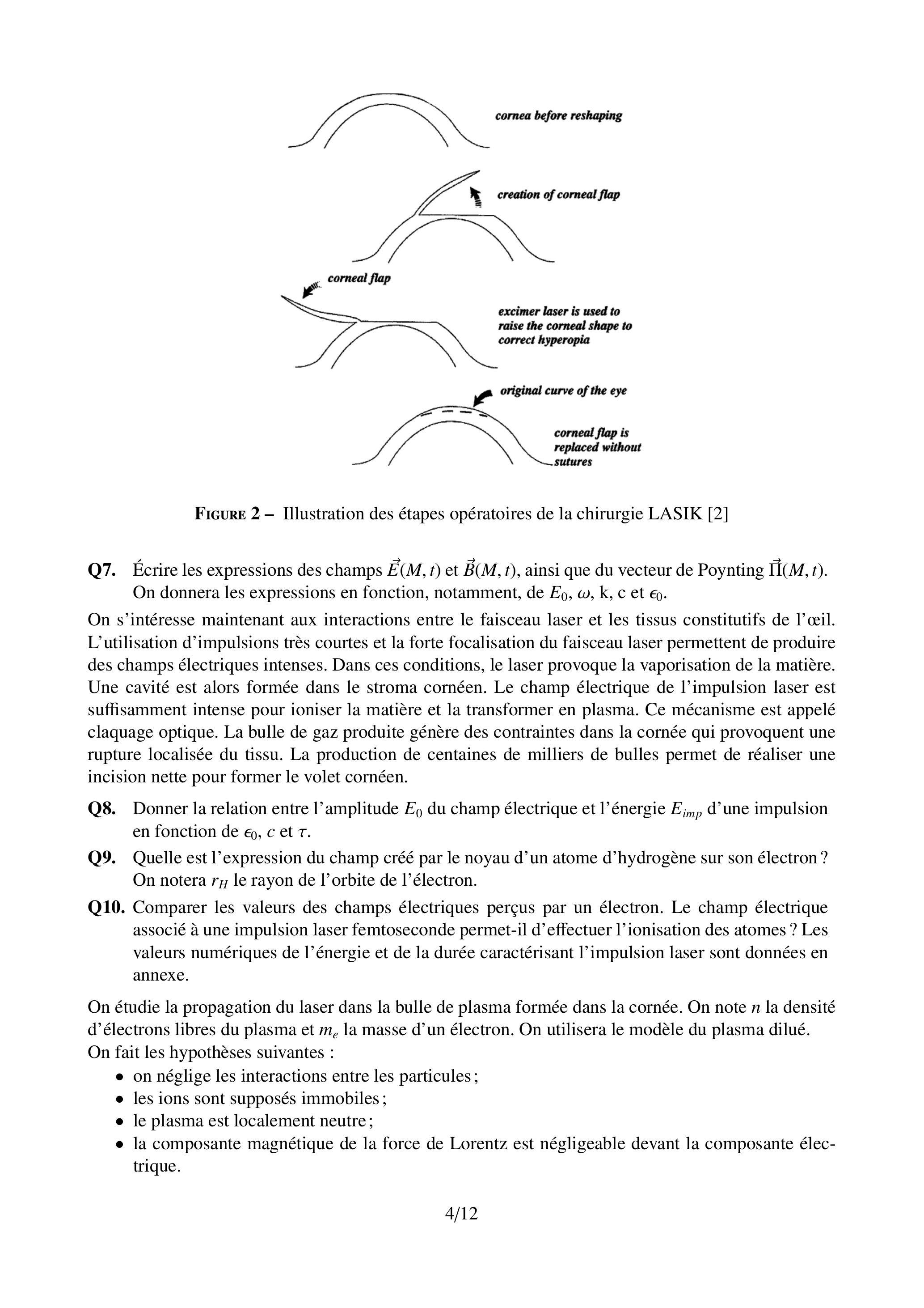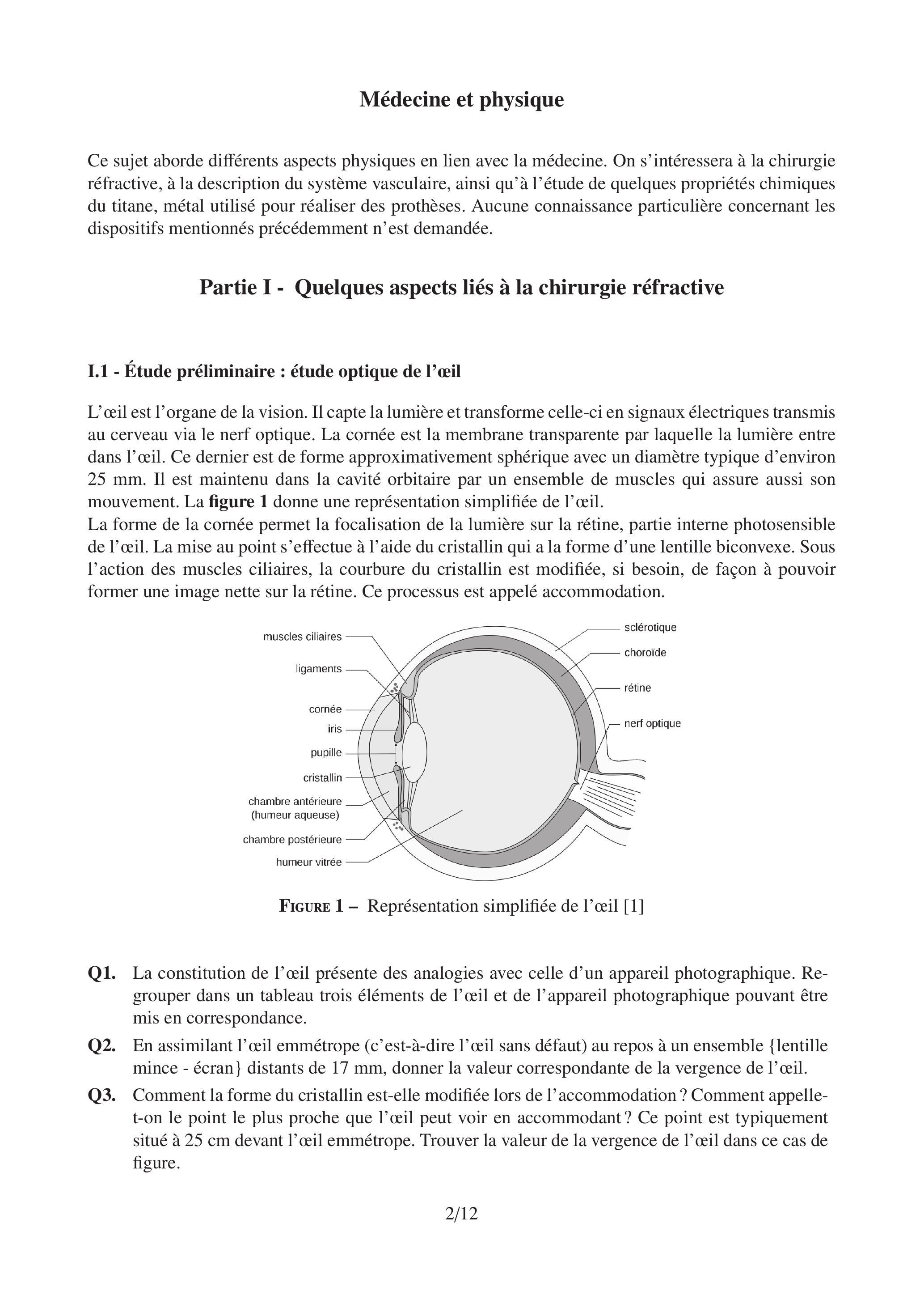 Ce sujet aborde différents aspects physiques en lien avec la médecine. On s'intéressera à la chirurgie réfractive, à la description du système vasculaire, ainsi qu'à l'étude de quelques propriétés chimiques du titane, métal utilisé pour réaliser des prothèses. Aucune connaissance particulière concernant les dispositifs mentionnés précédemment n'est demandée.