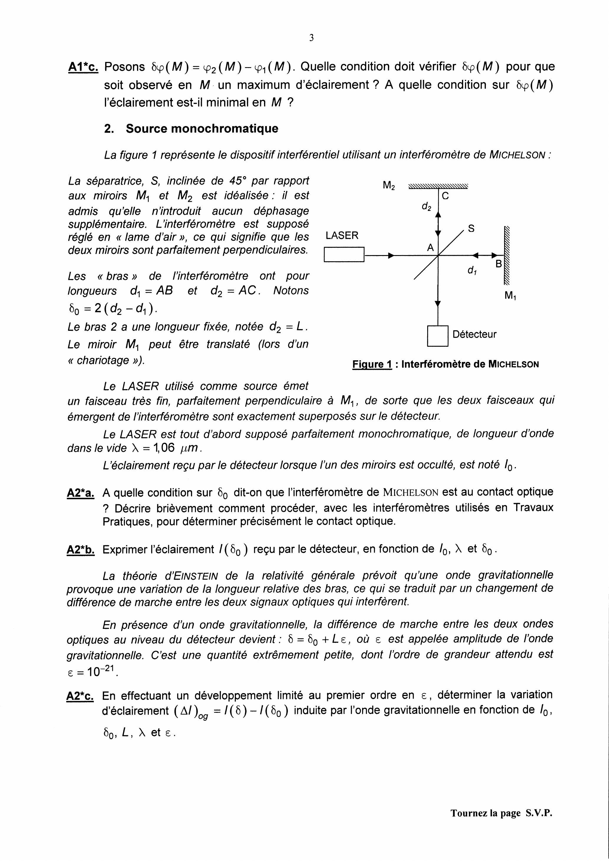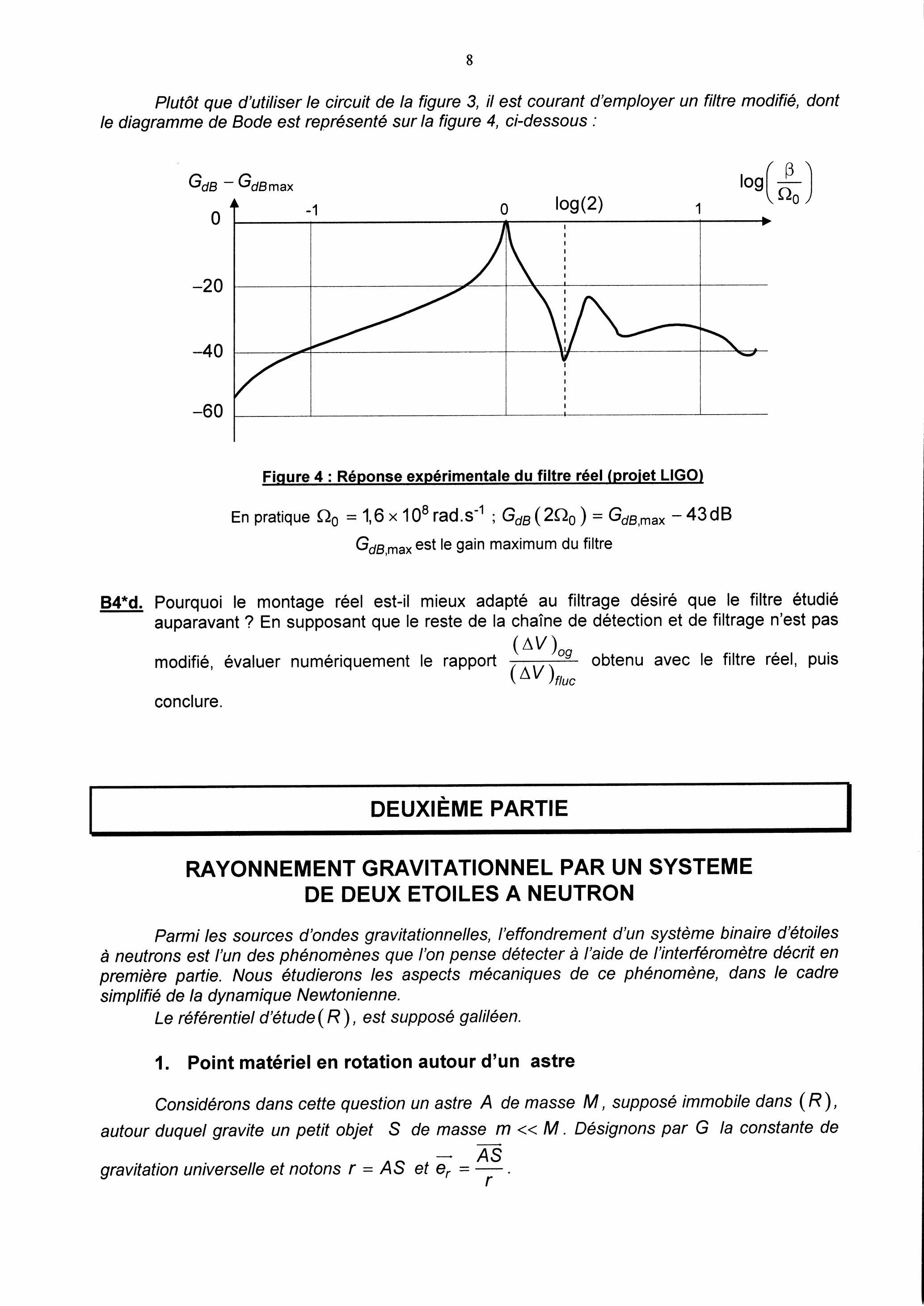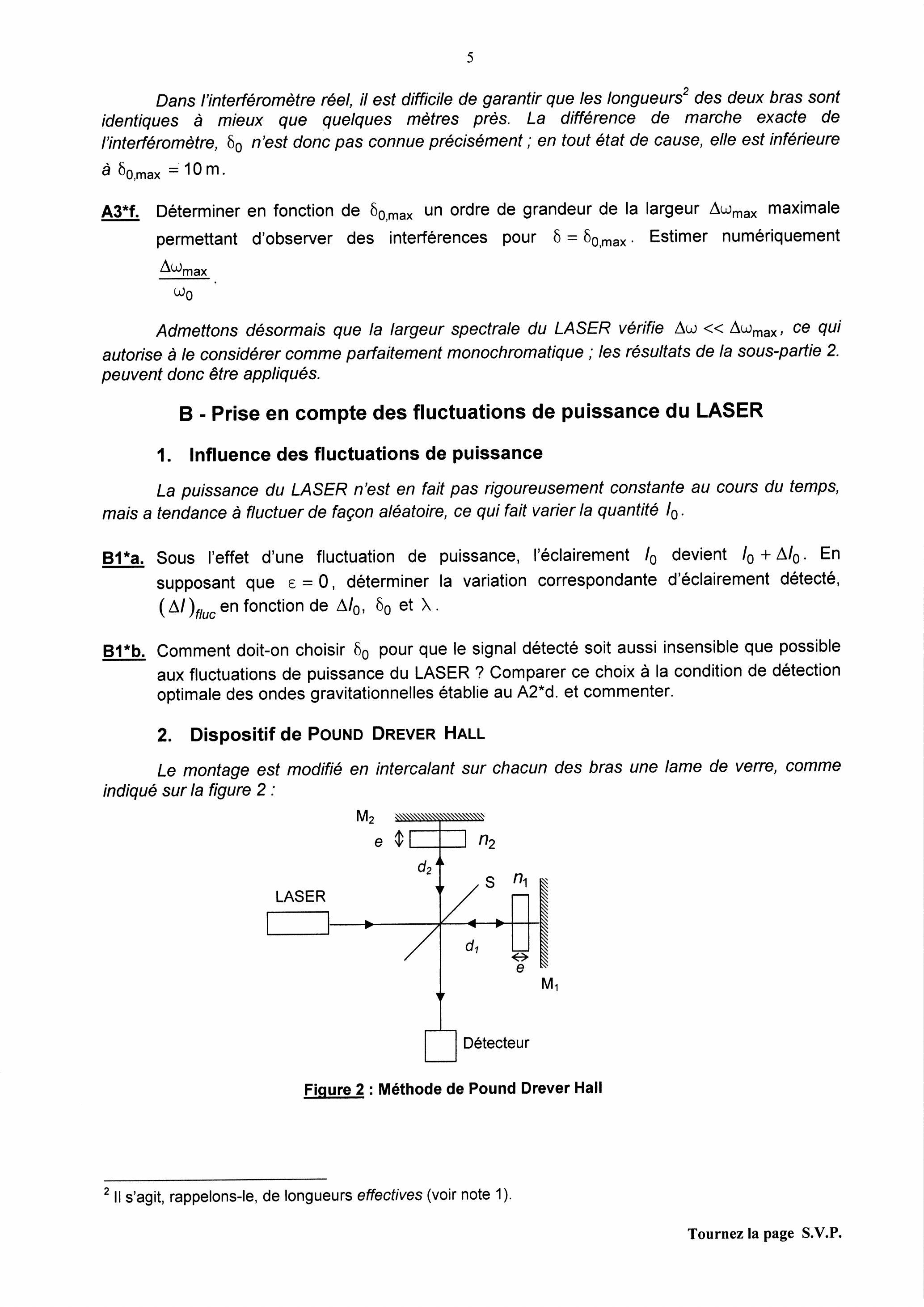 La première partie de ce problème aborde le principe physique de la méthode de détection envisagée ainsi qu'un des moyens permettant de s'affranchir des fluctuations de puissance du LASER utilisé. La deuxième partie s'intéresse à l'aspect mécanique d'un des systèmes physiques, source d'ondes gravitationnelles susceptibles d'être détectées. Les deux parties sont totalement indépendantes entre elles.