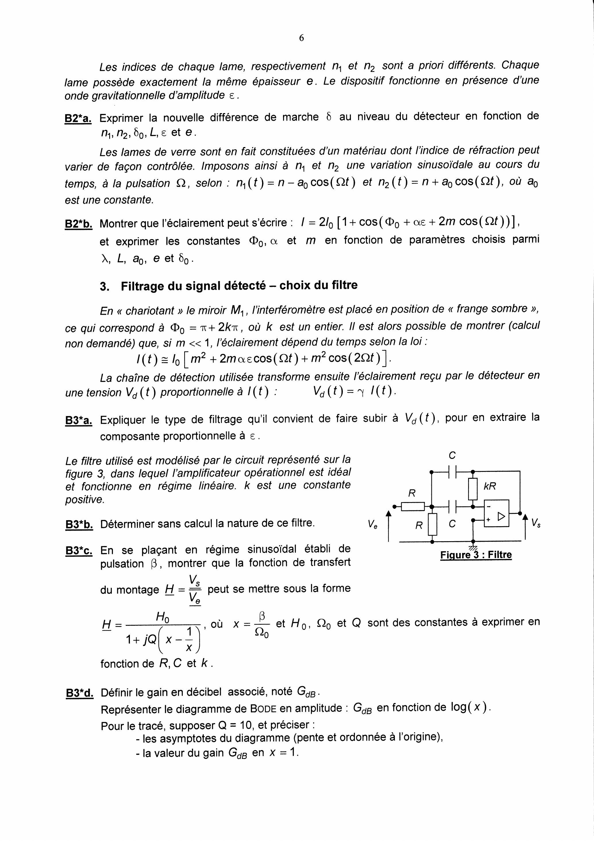 Le filtre utilisé est modélisé par le circuit représenté sur la figure 3, dans lequel l'amplificateur opérationnel est idéal et fonctionne en régime linéaire. est une constante positive.