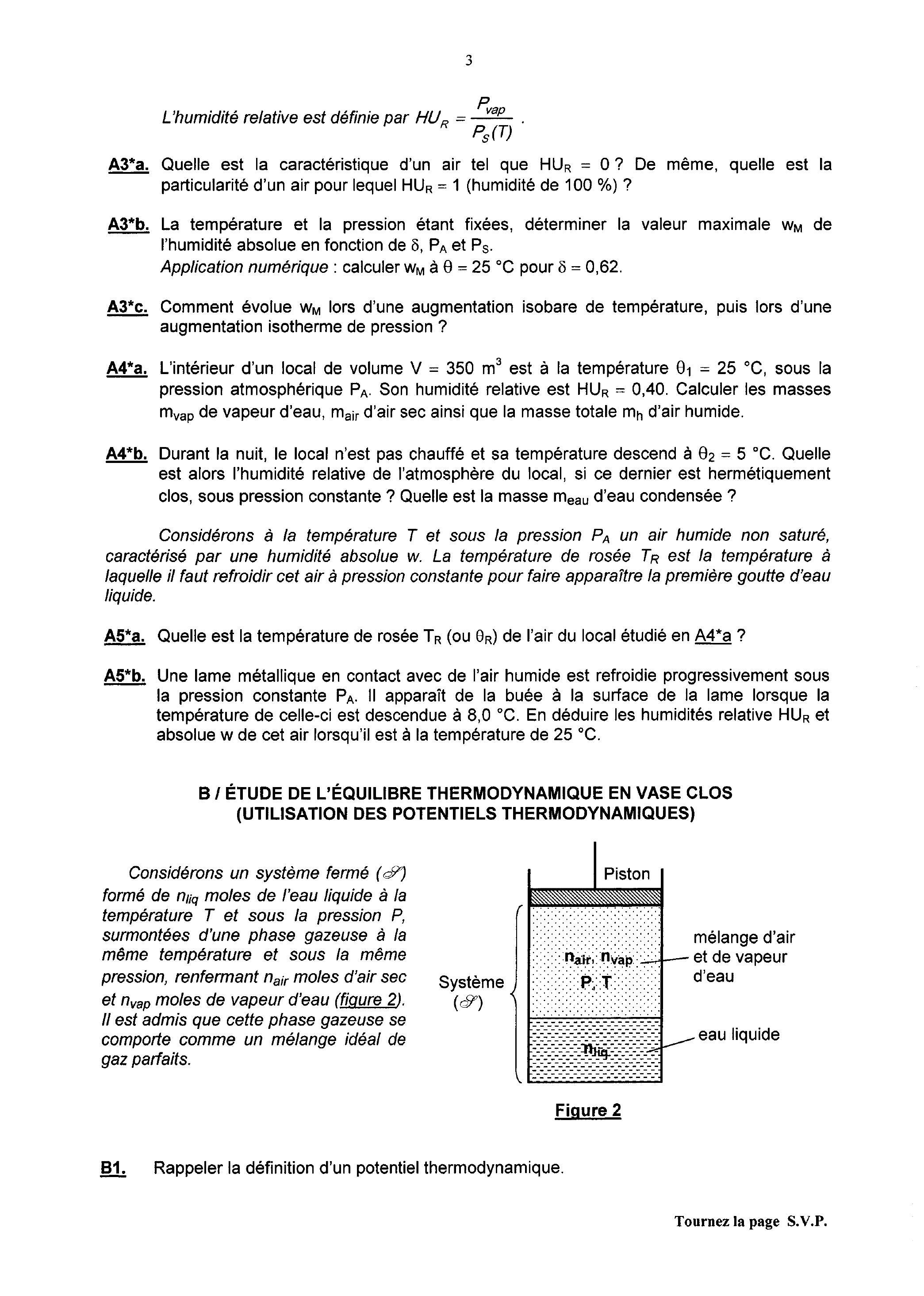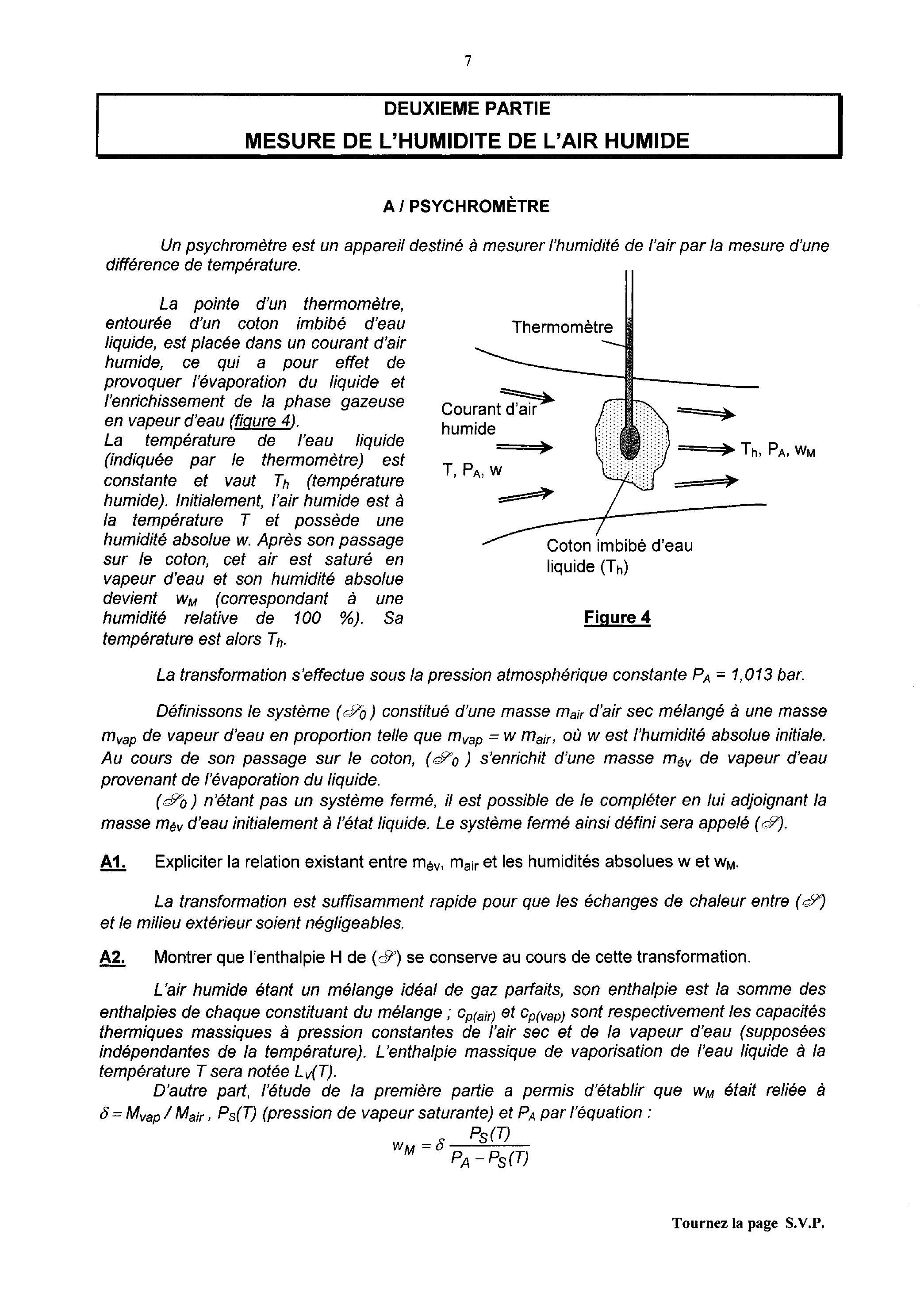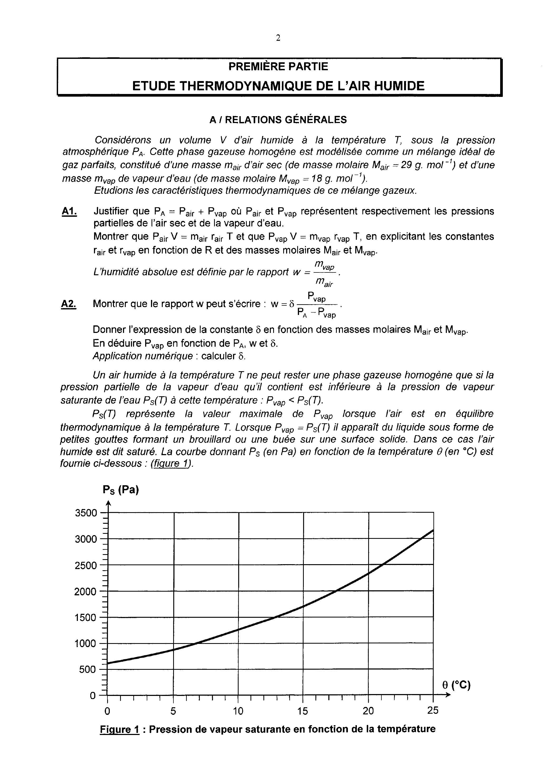 Ce problème étudie l'humidité de l'atmosphère. L'épreuve est divisée en deux parties totalement indépendantes. Divers aspects thermodynamiques d'un air humide sont abordés en première partie. Deux hygromètres, appareils destinés à mesurer l'humidité de l'air, sont étudiés en seconde partie : le psychromètre (appareil développé par Regnault au