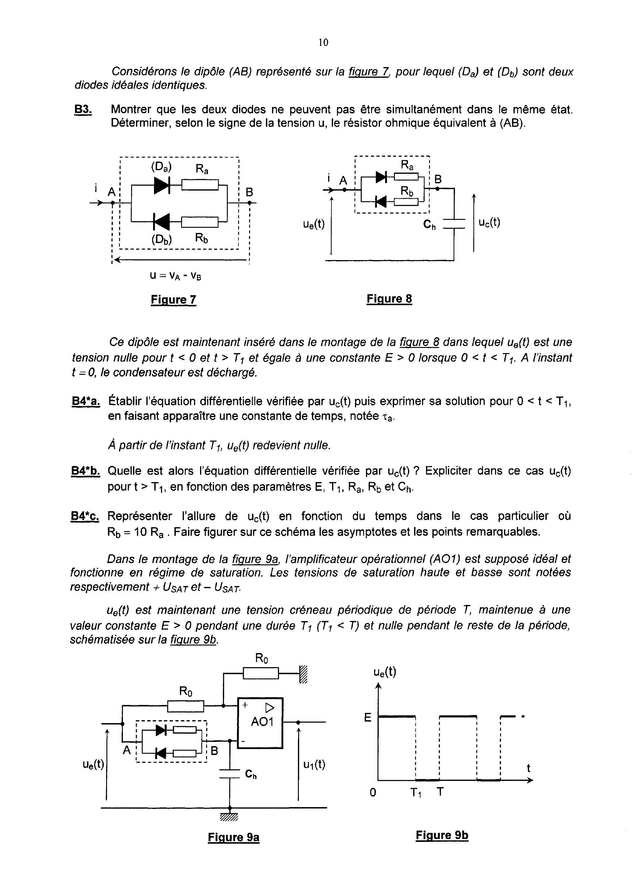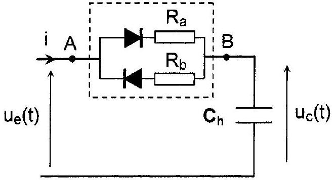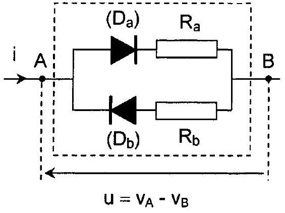B3. Montrer que les deux diodes ne peuvent pas être simultanément dans le même état. Déterminer, selon le signe de la tension u, le résistor ohmique équivalent à (AB).