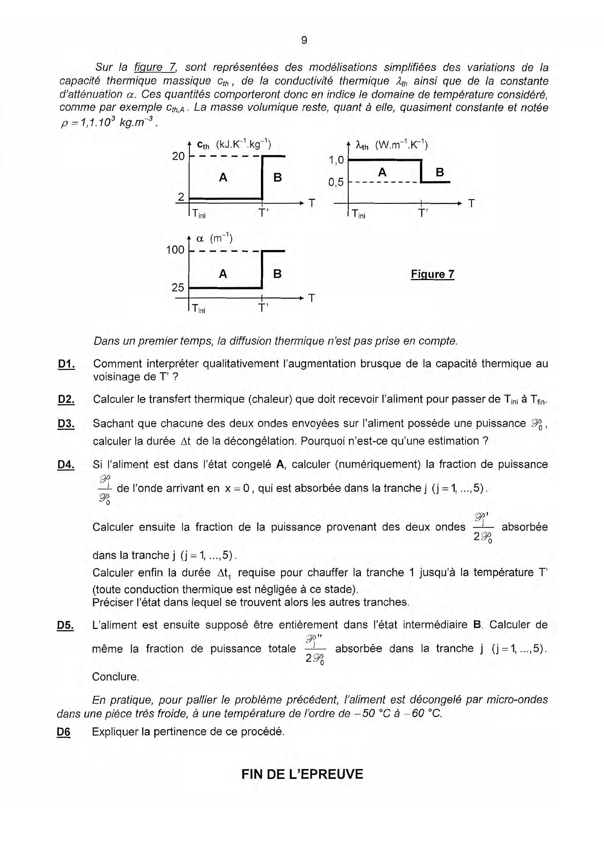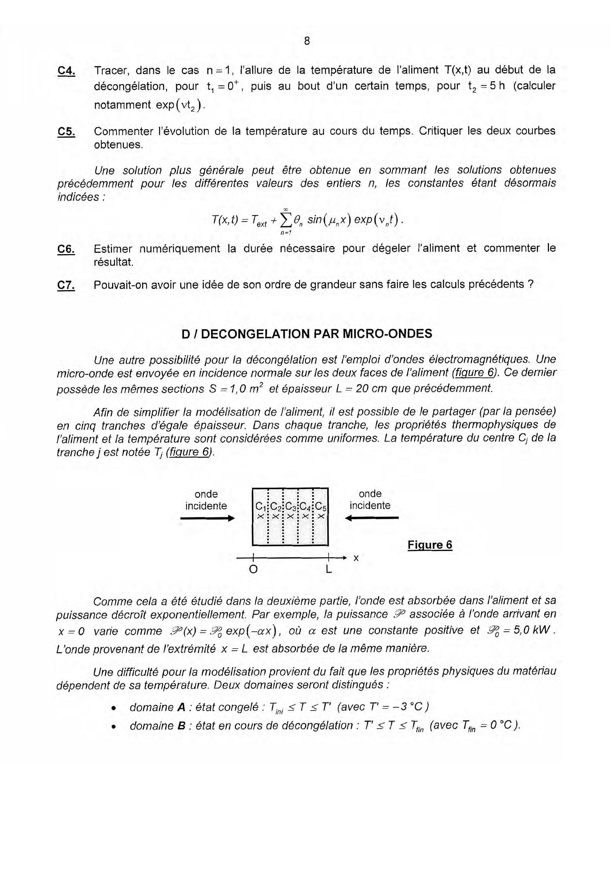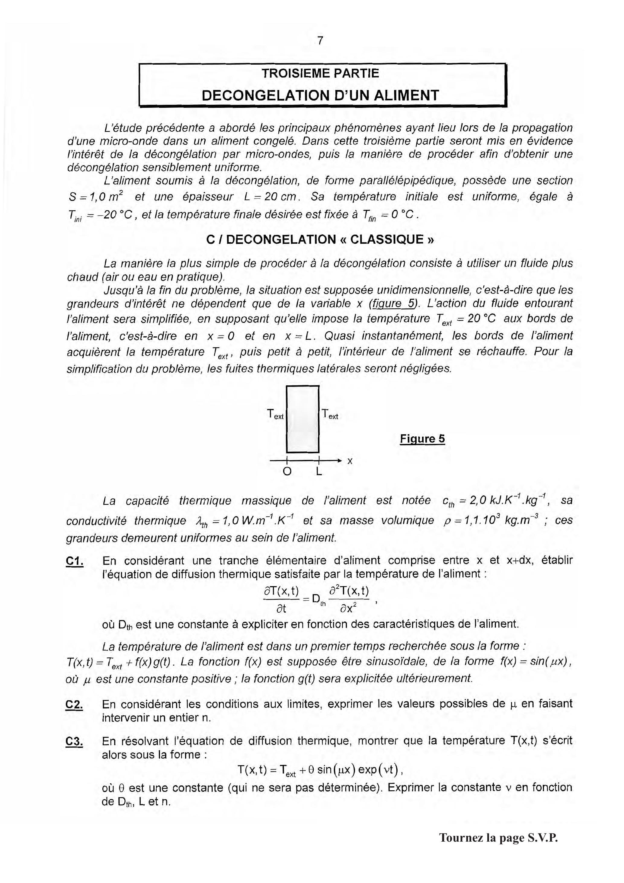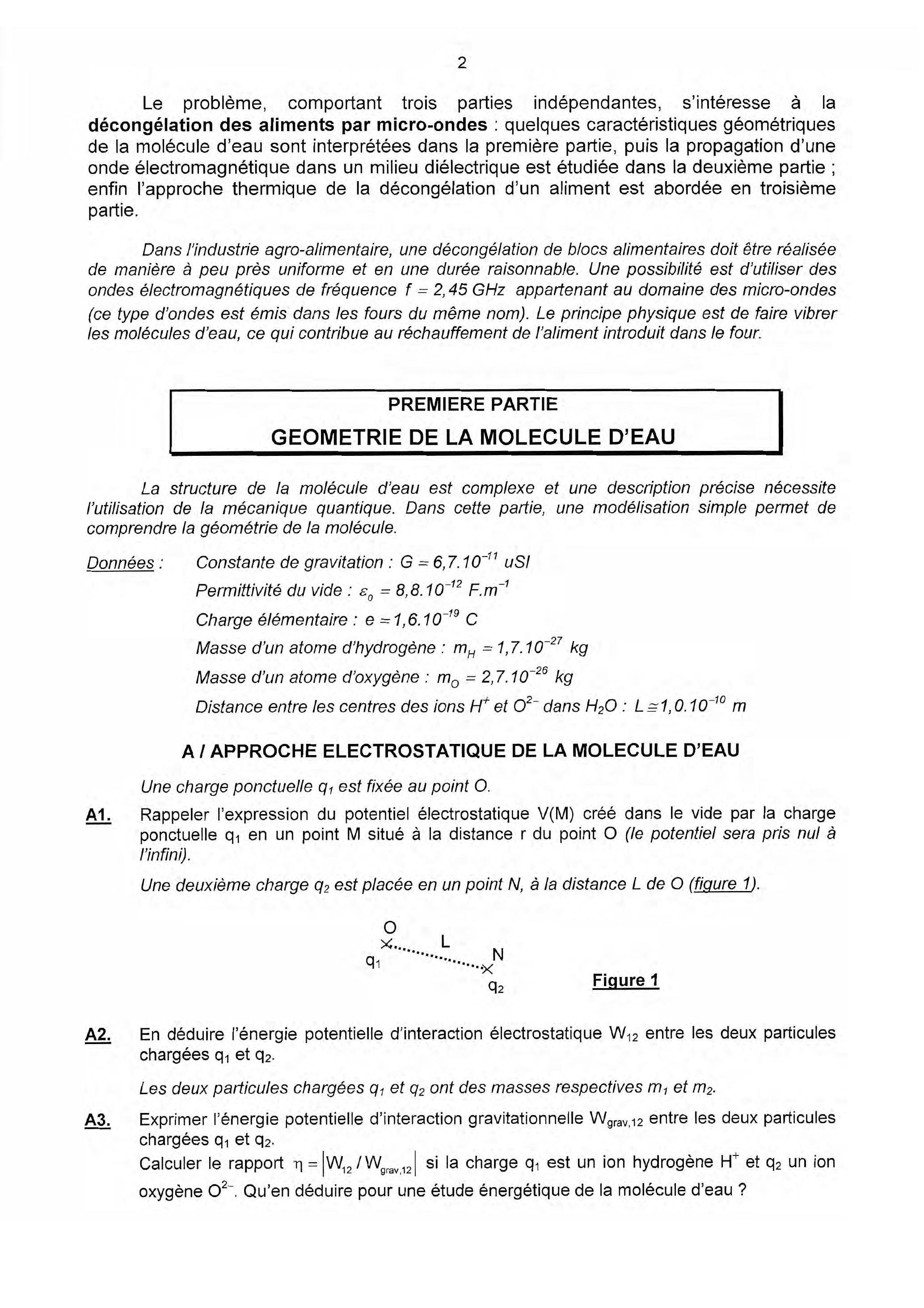 Le problème, comportant trois parties indépendantes, s'intéresse à la décongélation des aliments par micro-ondes : quelques caractéristiques géométriques de la molécule d'eau sont interprétées dans la première partie, puis la propagation d'une onde électromagnétique dans un milieu diélectrique est étudiée dans la deuxième partie ; enfin l'approche thermique de la décongélation d'un aliment est abordée en troisième partie.