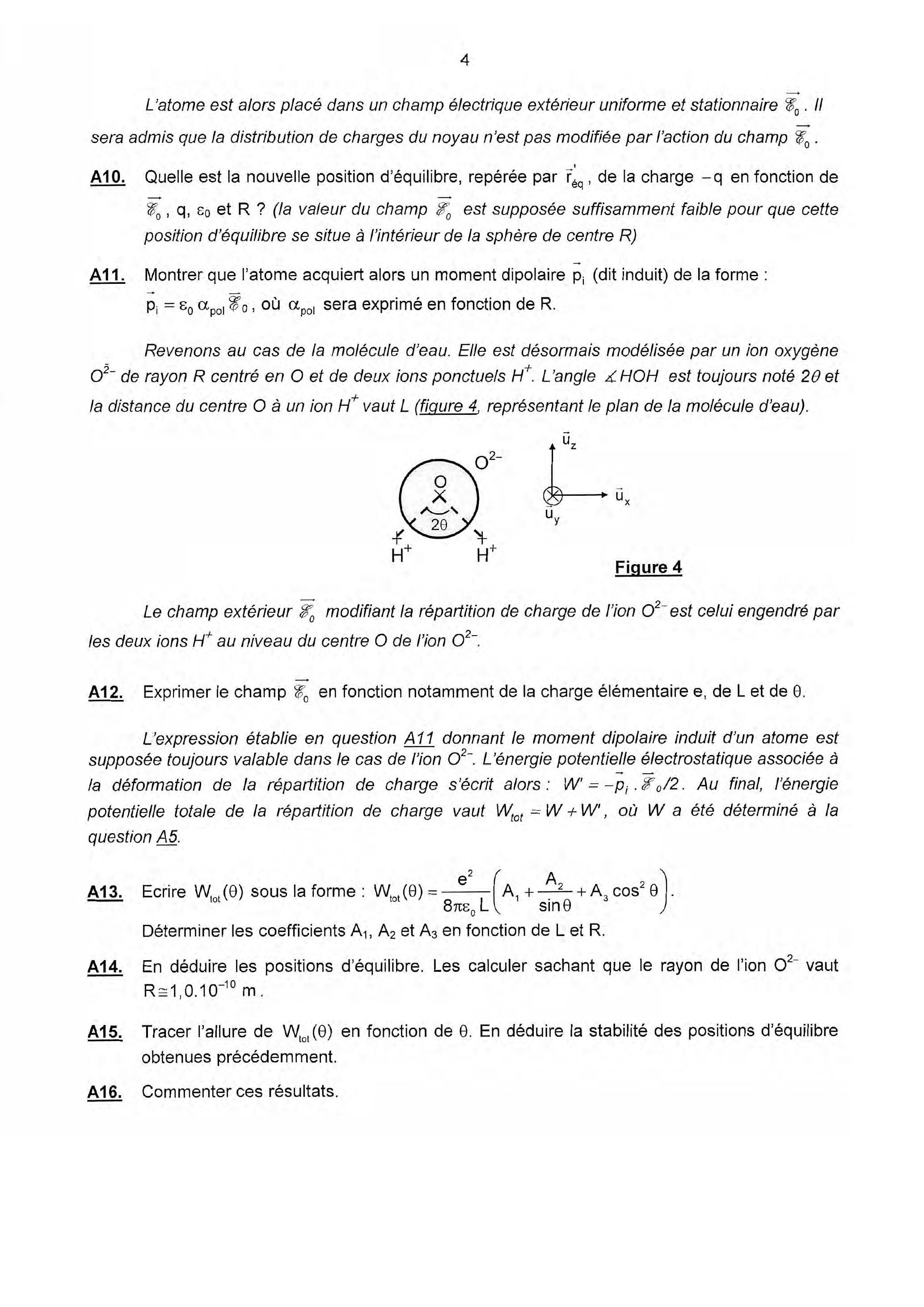 L'expression établie en question A11 donnant le moment dipolaire induit d'un atome est supposée toujours valable dans le cas de l'ion . L'énergie potentielle électrostatique associée à la déformation de la répartition de charge s'écrit alors: . Au final, l'énergie potentielle totale de la répartition de charge vaut , où a été déterminé à la question A5.