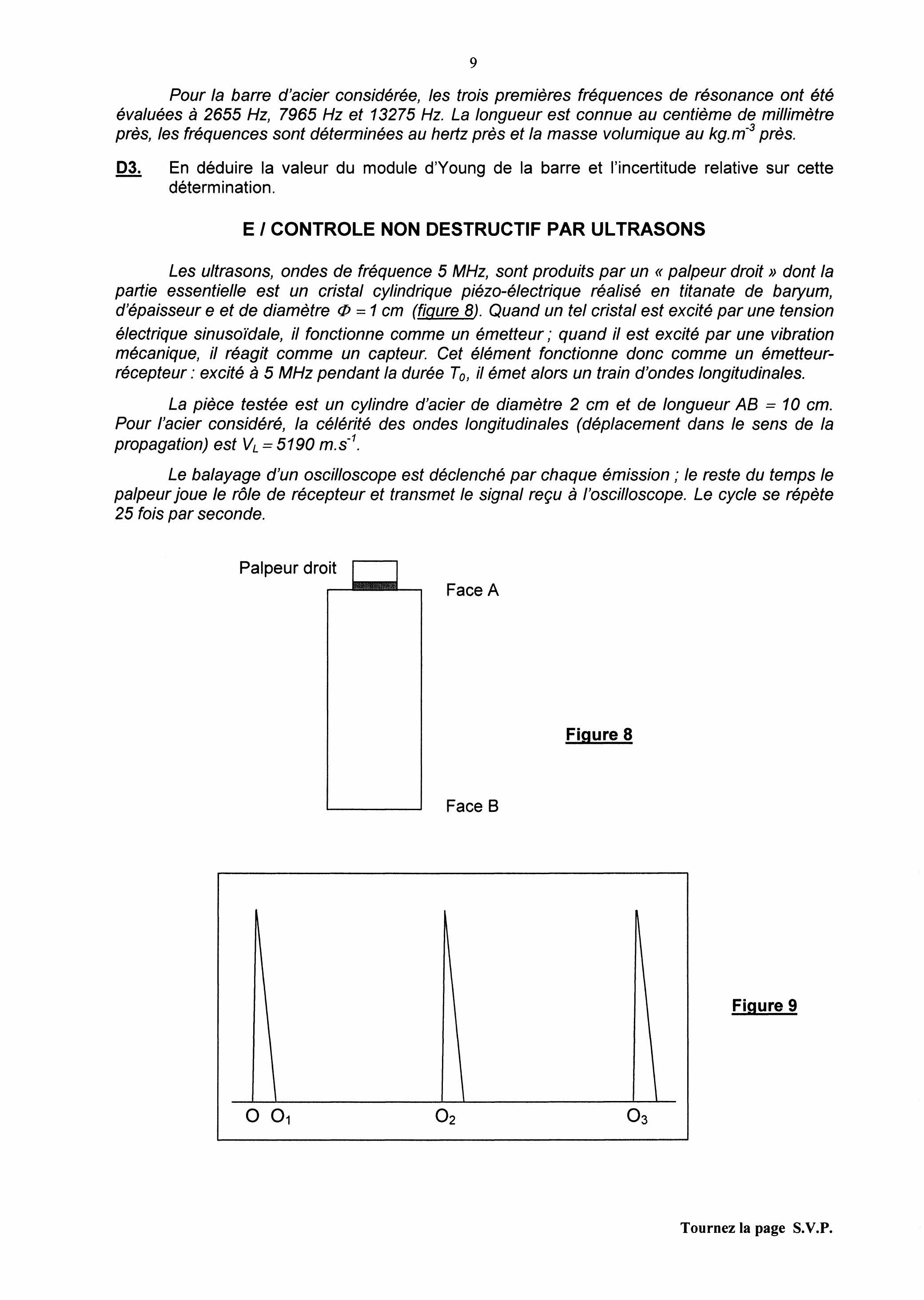 Les ultrasons, ondes de fréquence 5 MHz , sont produits par un «palpeur droit» dont la partie essentielle est un cristal cylindrique piézo-électrique réalisé en titanate de baryum, d'épaisseur e et de diamètre (figure 8). Quand un tel cristal est excité par une tension électrique sinusoïdale, il fonctionne comme un émetteur; quand il est excité par une vibration mécanique, il réagit comme un capteur. Cet élément fonctionne donc comme un émetteurrécepteur : excité à 5 MHz pendant la durée , il émet alors un train d'ondes longitudinales.