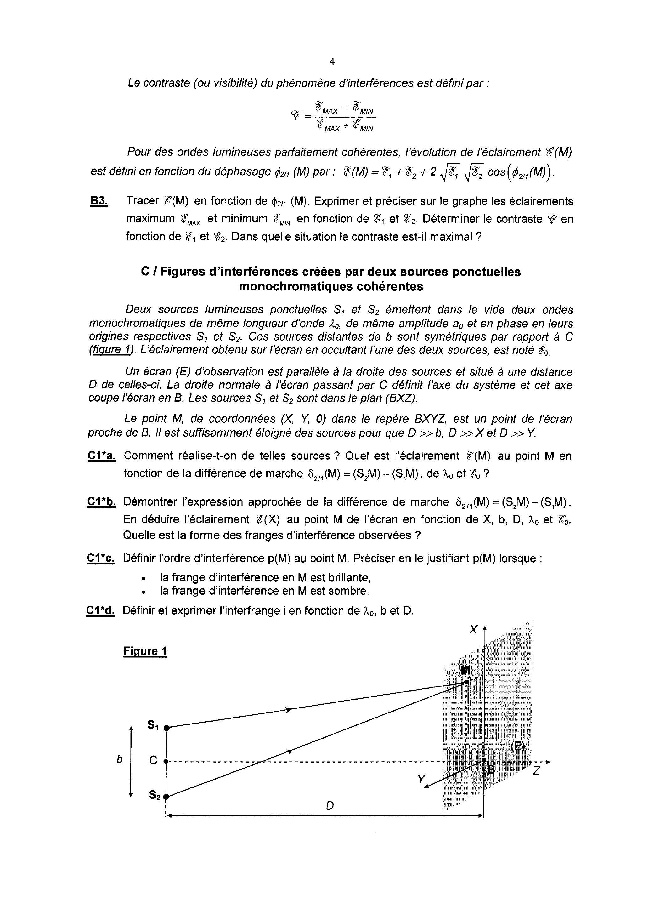 C2*b. Exprimer l'éclairement au point M de l'écran en fonction de et , puis en fonction de et . . Justifier la forme des franges d'interférences obtenues. L'ordre d'interférence en est-il croissant ou décroissant à partir du centre B ? Justifier la réponse.