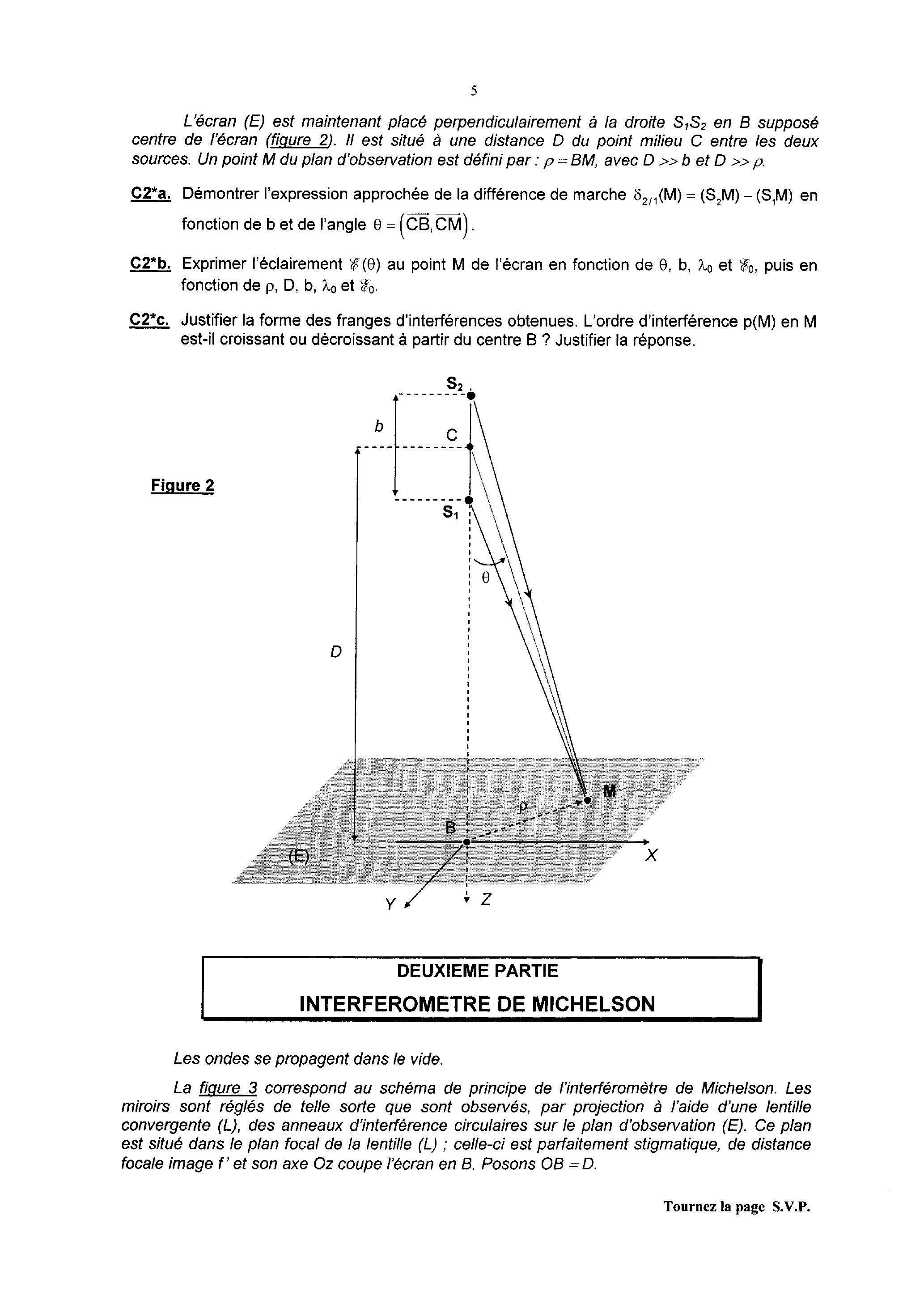 L'écran est maintenant placé perpendiculairement à la droite en supposé centre de l'écran (figure 2). II est situé à une distance du point milieu entre les deux sources. Un point du plan d'observation est défini par: , avec et . . Démontrer l'expression approchée de la différence de marche en fonction de b et de l'angle .
