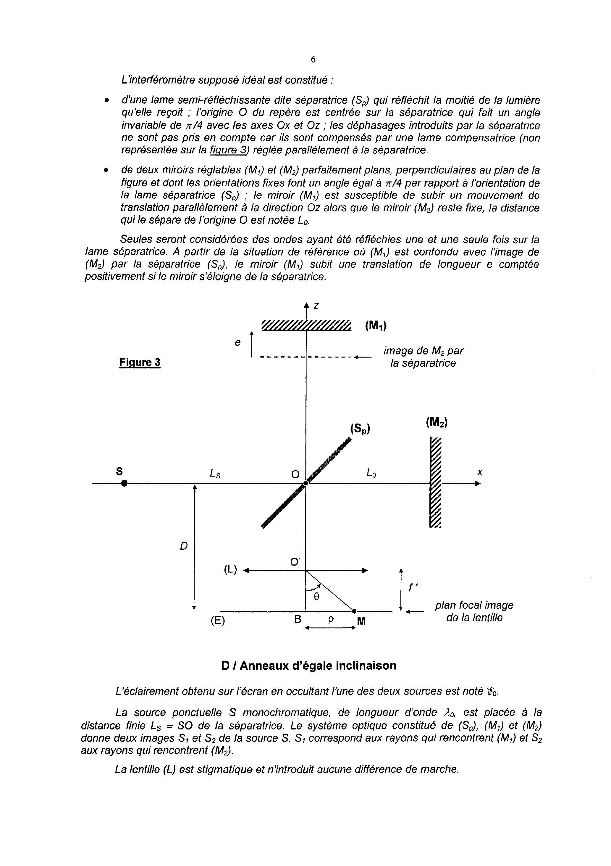 La figure 3 correspond au schéma de principe de l'interféromètre de Michelson. Les miroirs sont réglés de telle sorte que sont observés, par projection à l'aide d'une lentille convergente (L), des anneaux d'interférence circulaires sur le plan d'observation (E). Ce plan est situé dans le plan focal de la lentille (L) ; celle-ci est parfaitement stigmatique, de distance focale image et son axe coupe l'écran en B. Posons .