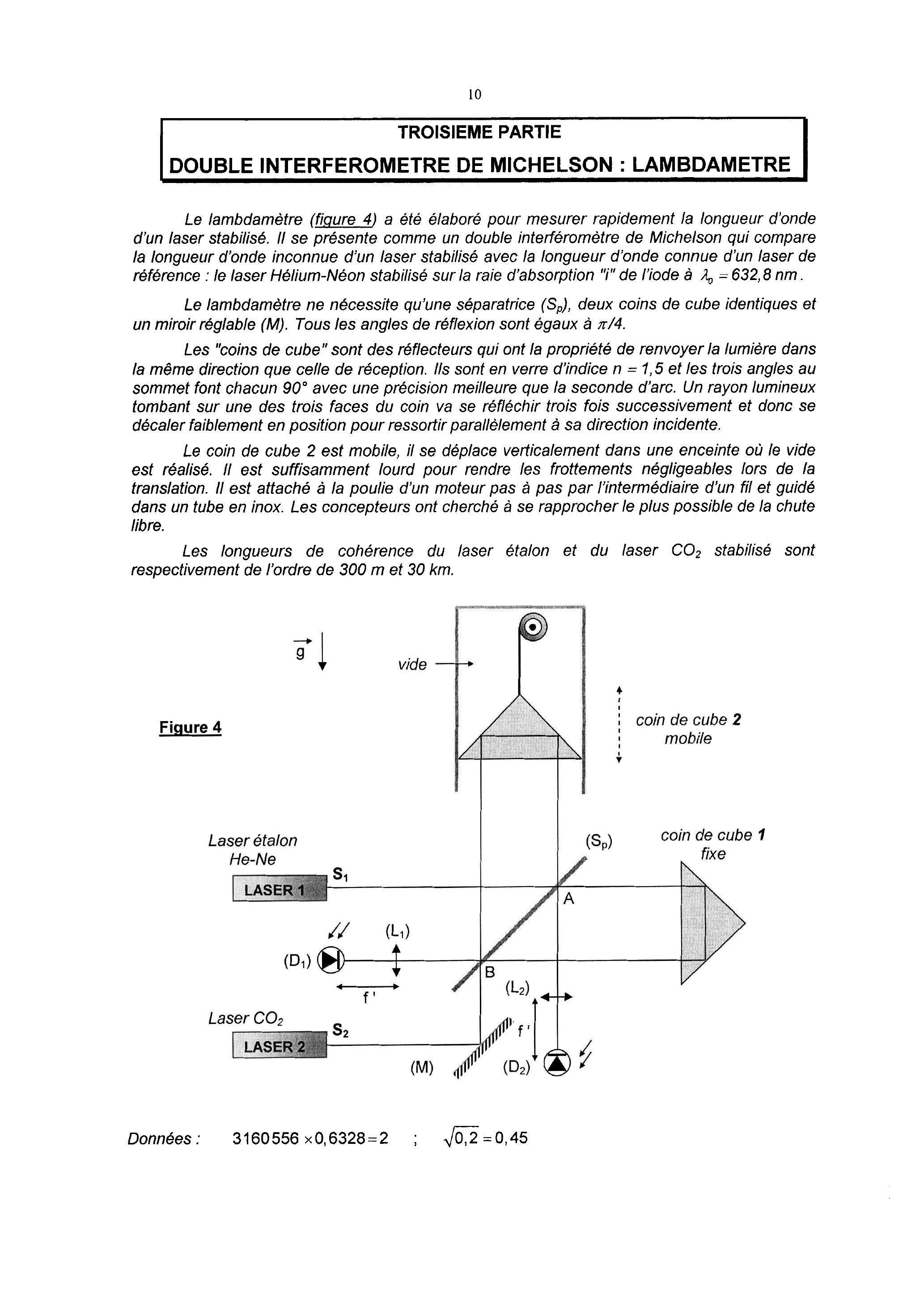 Le lambdamètre (figure 4) a été élaboré pour mesurer rapidement la longueur d'onde d'un laser stabilisé. II se présente comme un double interféromètre de Michelson qui compare la longueur d'onde inconnue d'un laser stabilisé avec la longueur d'onde connue d'un laser de référence : le laser Hélium-Néon stabilisé sur la raie d'absorption "i" de l'iode à .