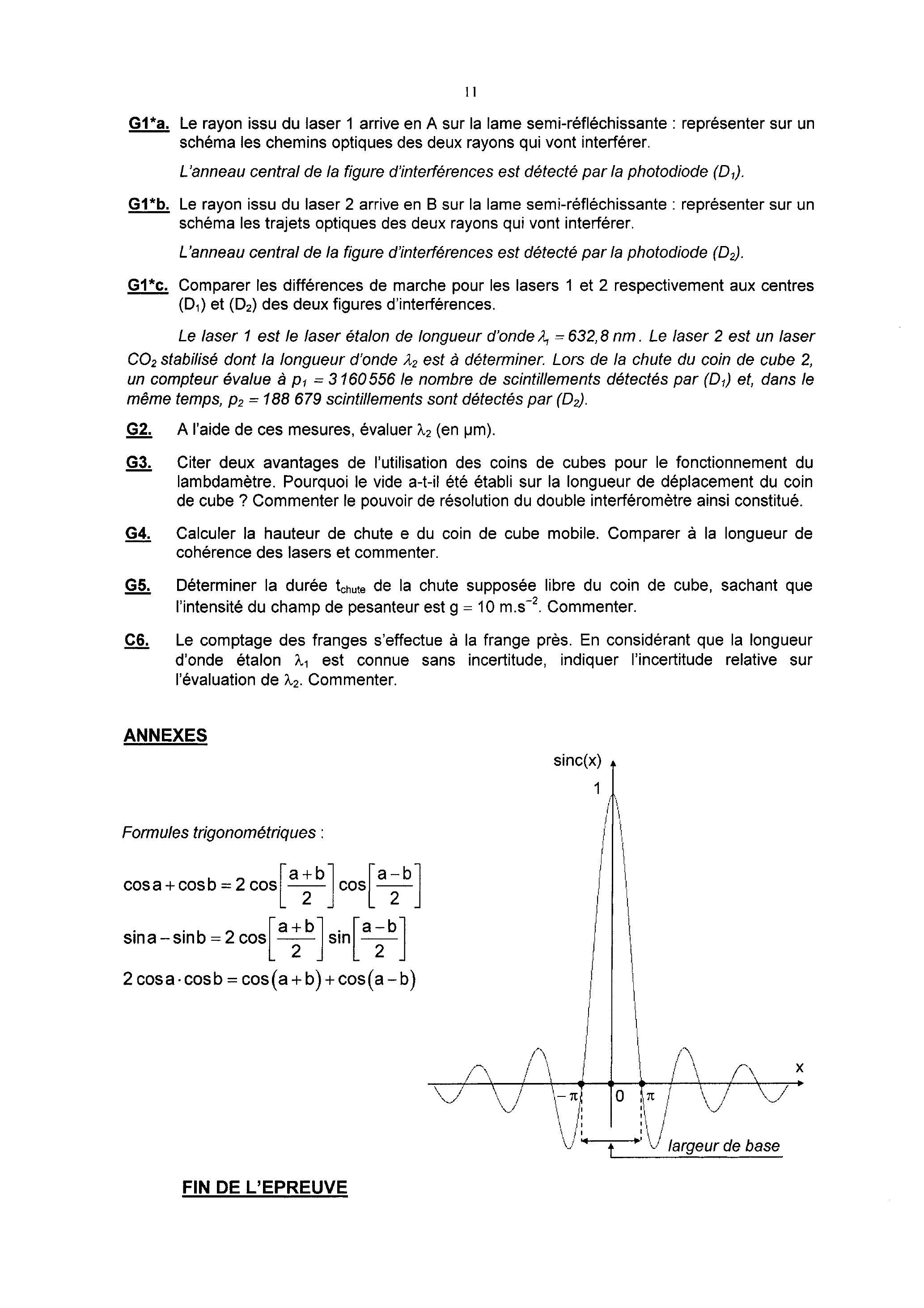 Le laser 1 est le laser étalon de longueur d'onde . Le laser 2 est un laser stabilisé dont la longueur d'onde est à déterminer. Lors de la chute du coin de cube 2 , un compteur évalue à le nombre de scintillements détectés par ( ) et, dans le même temps, scintillements sont détectés par ( ).