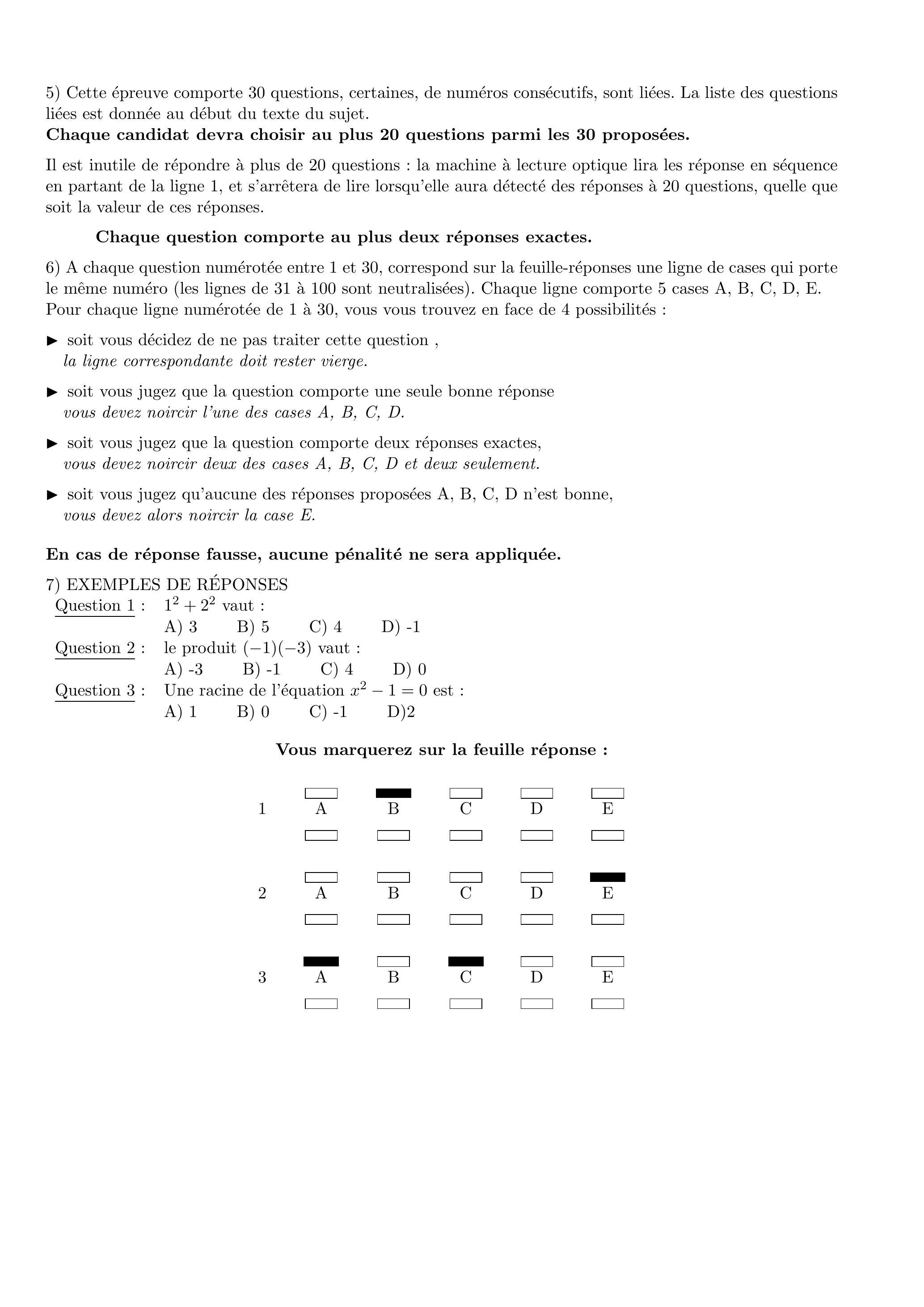 L'épreuve de mathématiques de ce concours est un questionnaire à choix multiple qui sera corrigé automatiquement par une machine à lecture optique.