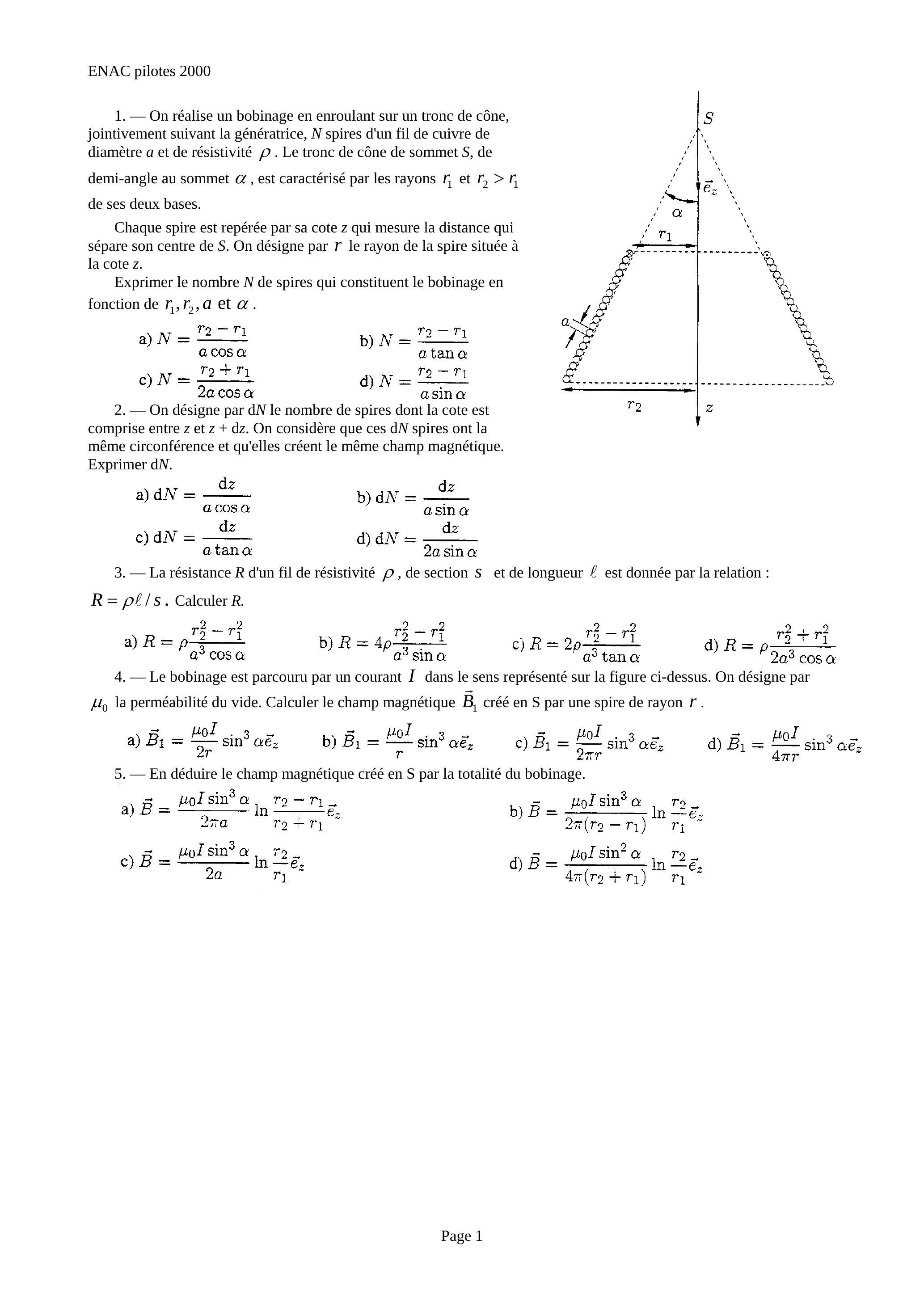 On réalise un bobinage en enroulant sur un tronc de cône, jointivement suivant la génératrice, spires d'un fil de cuivre de diamètre et de résistivité . Le tronc de cône de sommet , de demi-angle au sommet , est caractérisé par les rayons et de ses deux bases.