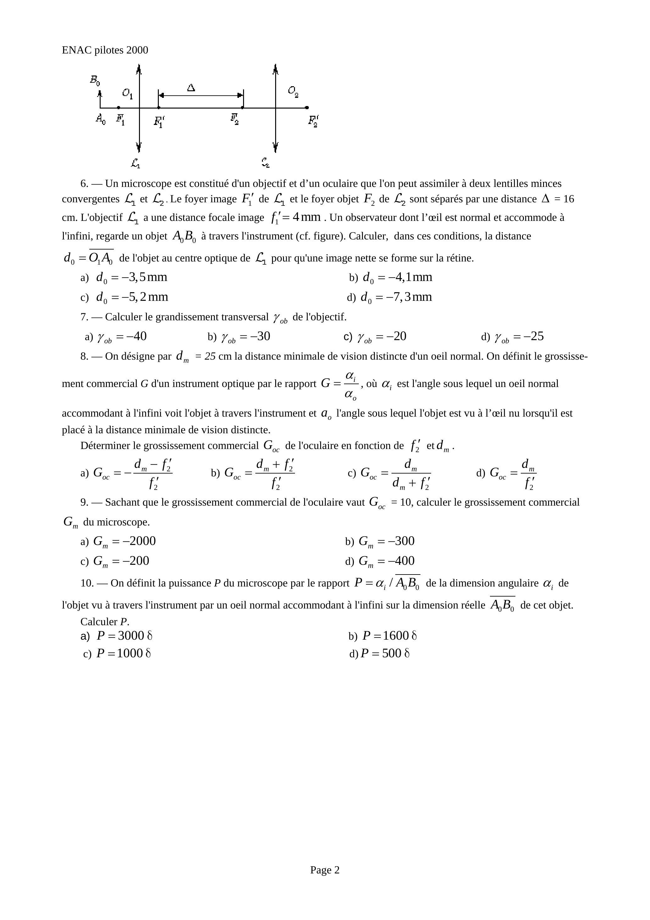 10. - On définit la puissance du microscope par le rapport de la dimension angulaire de l'objet vu à travers l'instrument par un oeil normal accommodant à l'infini sur la dimension réelle de cet objet. Calculer .