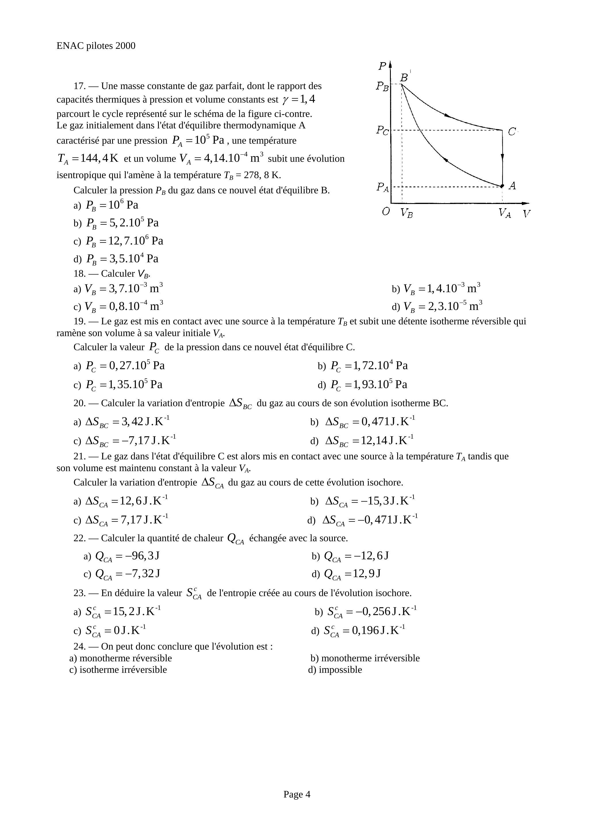 17. - Une masse constante de gaz parfait, dont le rapport des capacités thermiques à pression et volume constants est parcourt le cycle représenté sur le schéma de la figure ci-contre. Le gaz initialement dans l'état d'équilibre thermodynamique A caractérisé par une pression , une température et un volume subit une évolution isentropique qui l'amène à la température .
