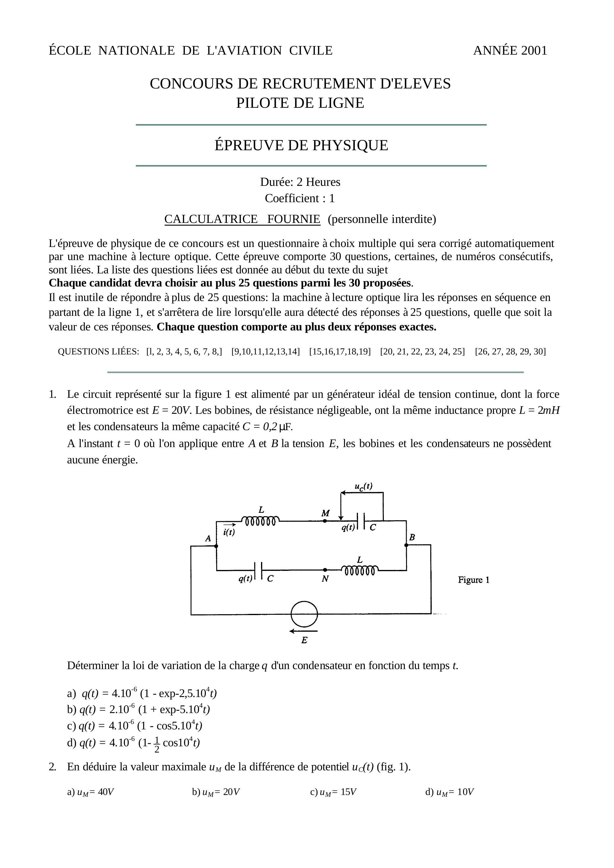 ENAC Physique QCM MPSI 2001 - Version Web LaTeX | WikiPrépa | WikiPrépa