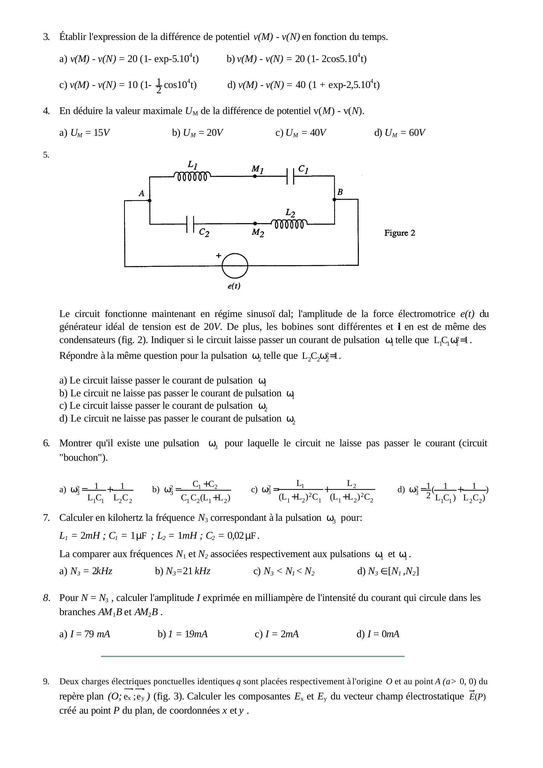 Le circuit fonctionne maintenant en régime sinusoï dal; l'amplitude de la force électromotrice du générateur idéal de tension est de 20 V . De plus, les bobines sont différentes et en est de même des condensateurs (fig. 2). Indiquer si le circuit laisse passer un courant de pulsation telle que . Répondre à la même question pour la pulsation telle que .