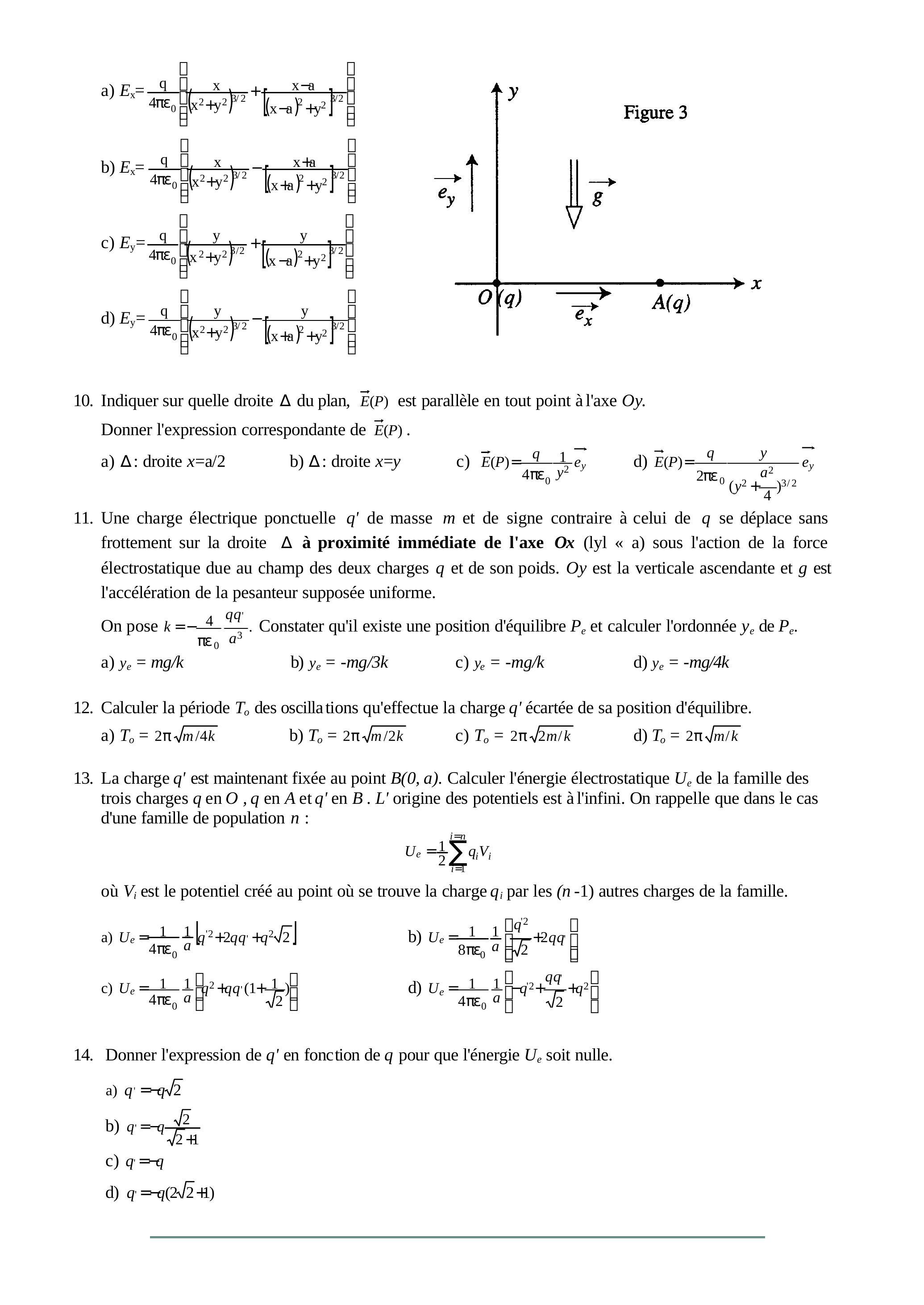 11. Une charge électrique ponctuelle de masse et de signe contraire à celui de se déplace sans frottement sur la droite à proximité immédiate de l'axe (lyl « a) sous l'action de la force électrostatique due au champ des deux charges et de son poids. Oy est la verticale ascendante et est l'accélération de la pesanteur supposée uniforme.