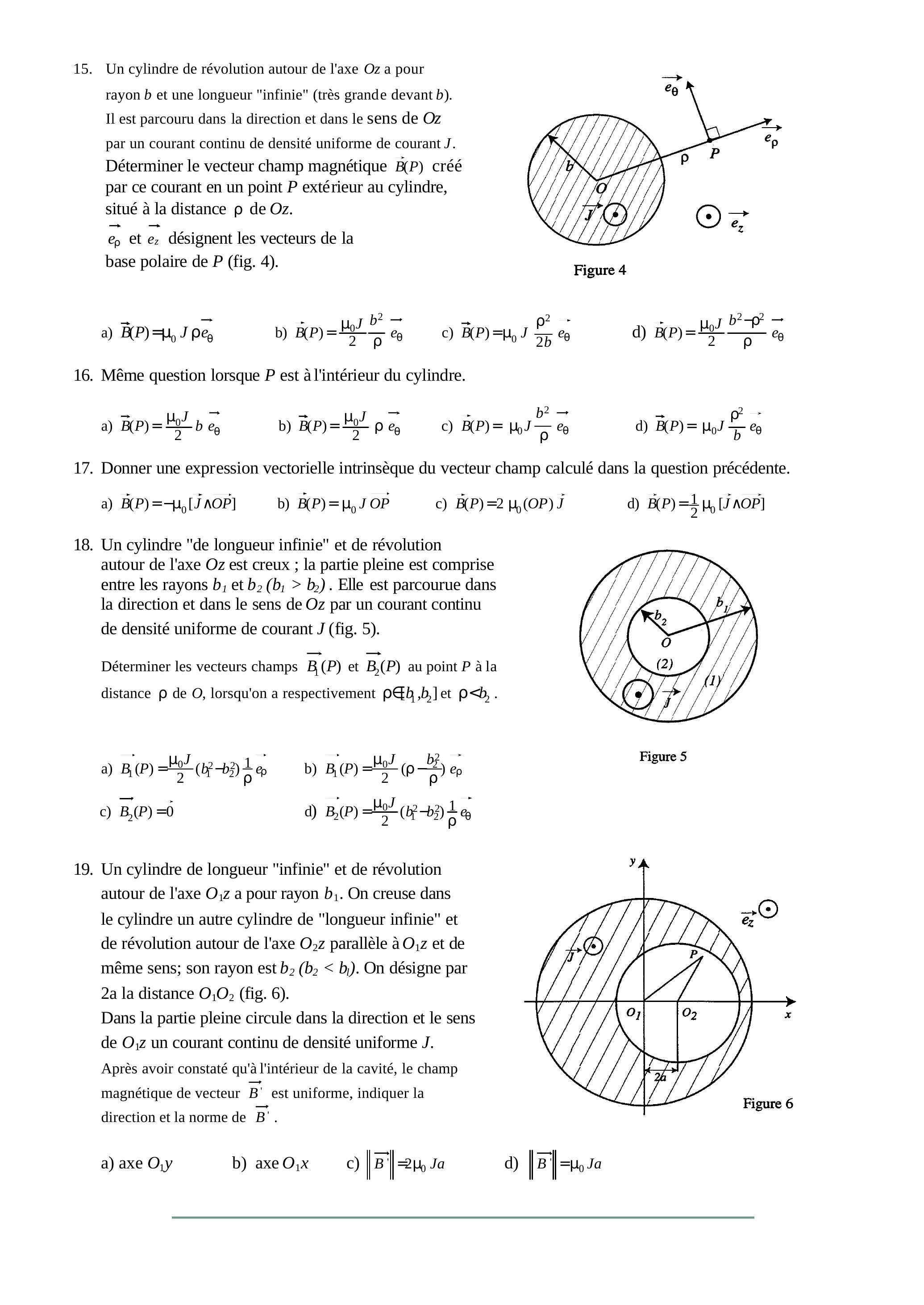 15. Un cylindre de révolution autour de l'axe a pour rayon et une longueur "infinie" (très grande devant ). Il est parcouru dans la direction et dans le sens de par un courant continu de densité uniforme de courant . Déterminer le vecteur champ magnétique créé par ce courant en un point extérieur au cylindre, situé à la distance de .