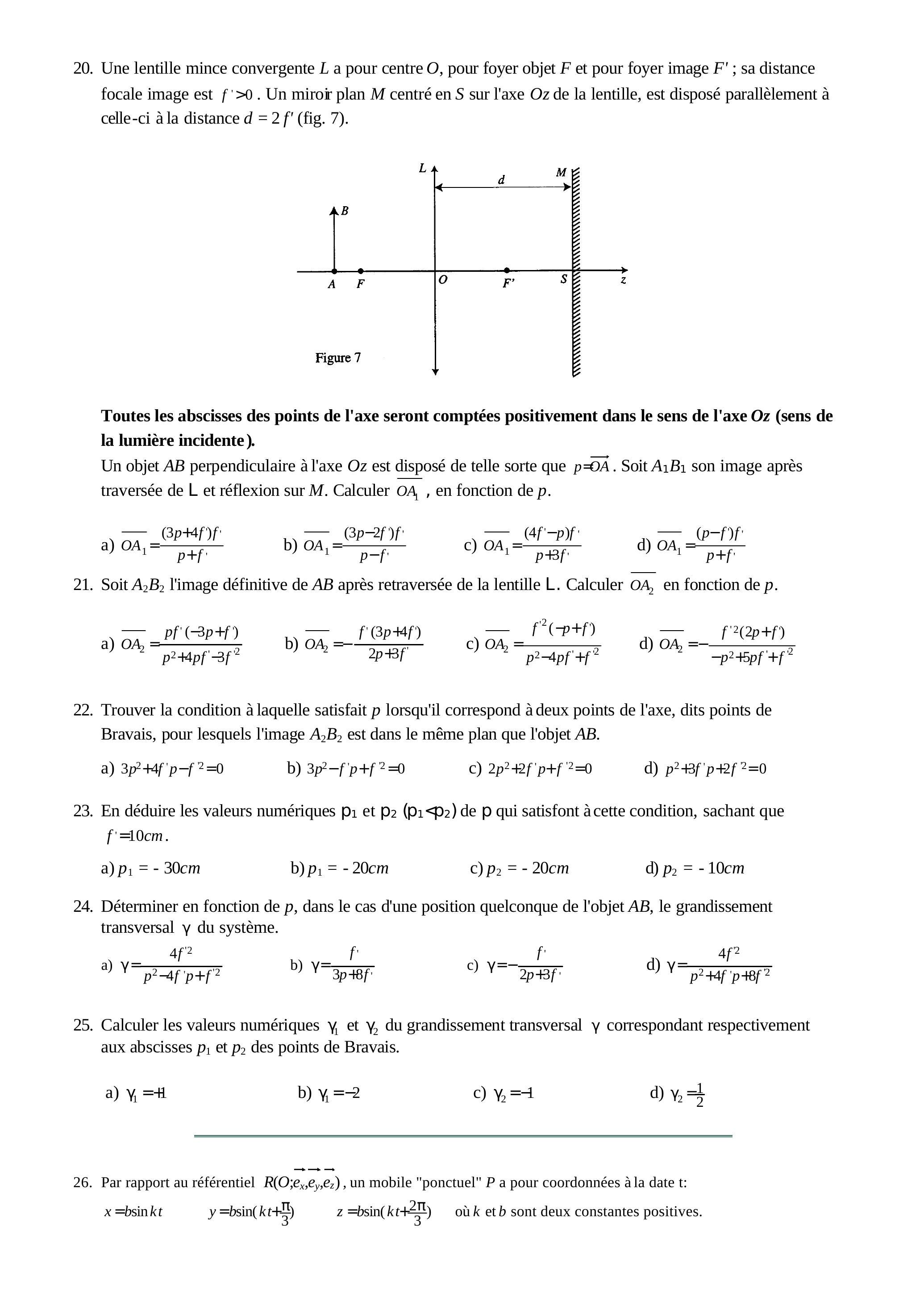 25. Calculer les valeurs numériques et du grandissement transversal correspondant respectivement aux abscisses et des points de Bravais.