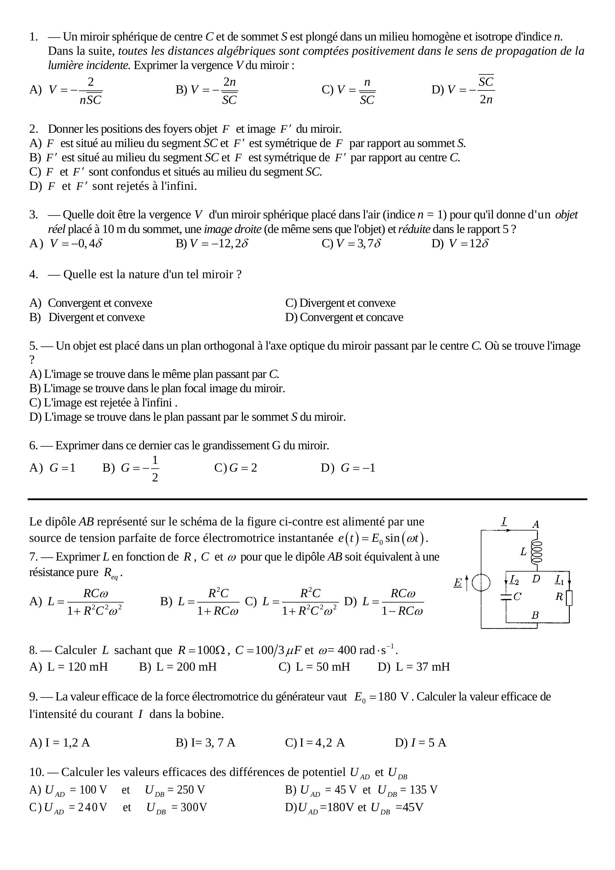 ENAC Physique QCM MPSI 2004 - Version Web LaTeX | WikiPrépa | WikiPrépa