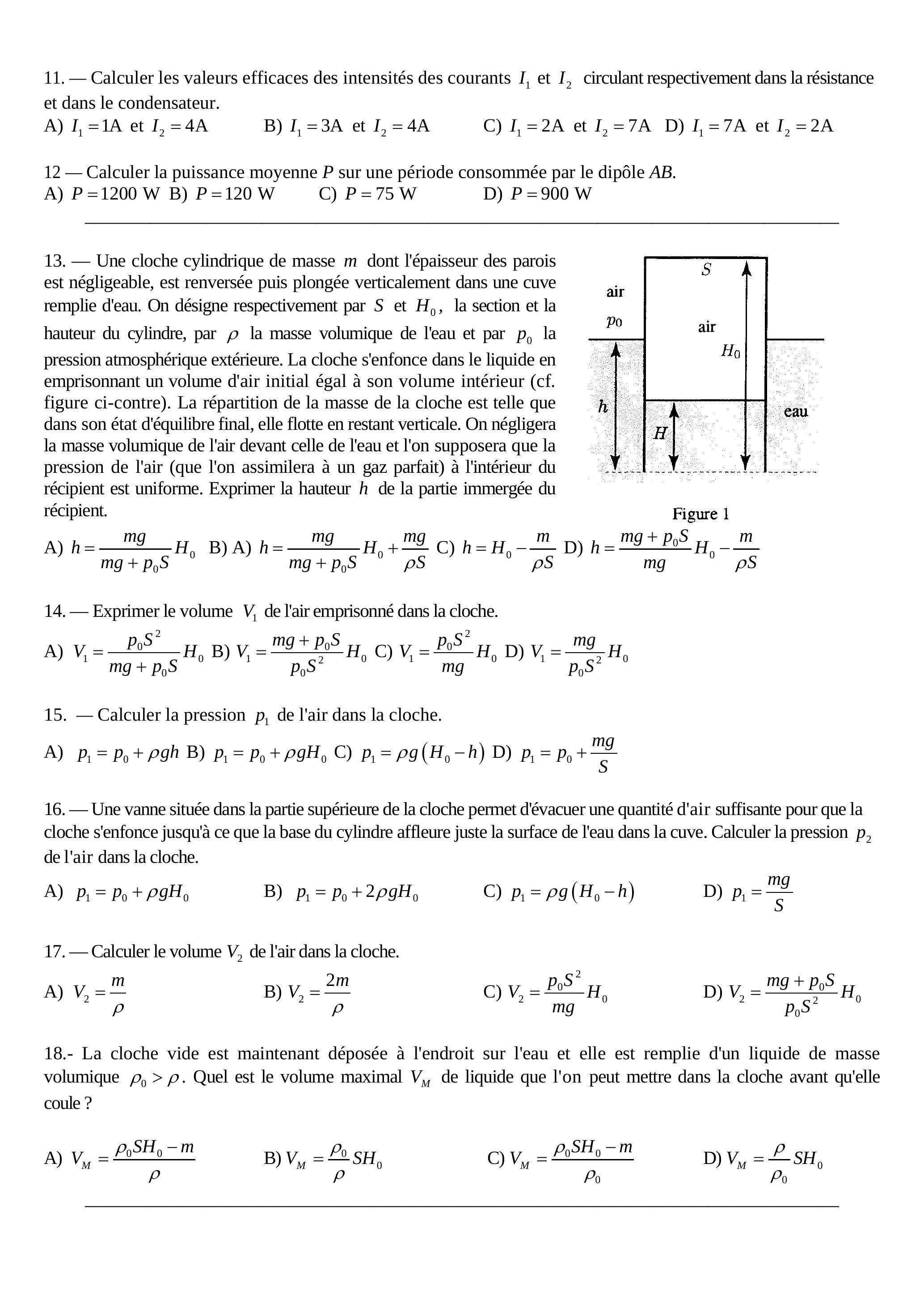 13. - Une cloche cylindrique de masse dont l'épaisseur des parois est négligeable, est renversée puis plongée verticalement dans une cuve remplie d'eau. On désigne respectivement par et , la section et la hauteur du cylindre, par la masse volumique de l'eau et par la pression atmosphérique extérieure. La cloche s'enfonce dans le liquide en emprisonnant un volume d'air initial égal à son volume intérieur (cf. figure ci-contre). La répartition de la masse de la cloche est telle que dans son état d'équilibre final, elle flotte en restant verticale. On négligera la masse volumique de l'air devant celle de l'eau et l'on supposera que la pression de l'air (que l'on assimilera à un gaz parfait) à l'intérieur du récipient est uniforme. Exprimer la hauteur de la partie immergée du récipient.