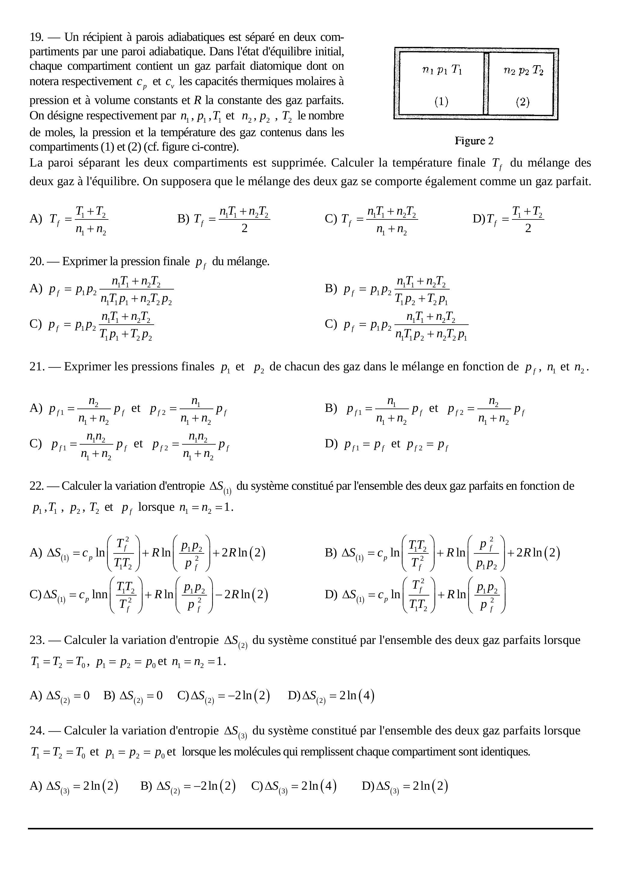 23. - Calculer la variation d'entropie du système constitué par l'ensemble des deux gaz parfaits lorsque et .