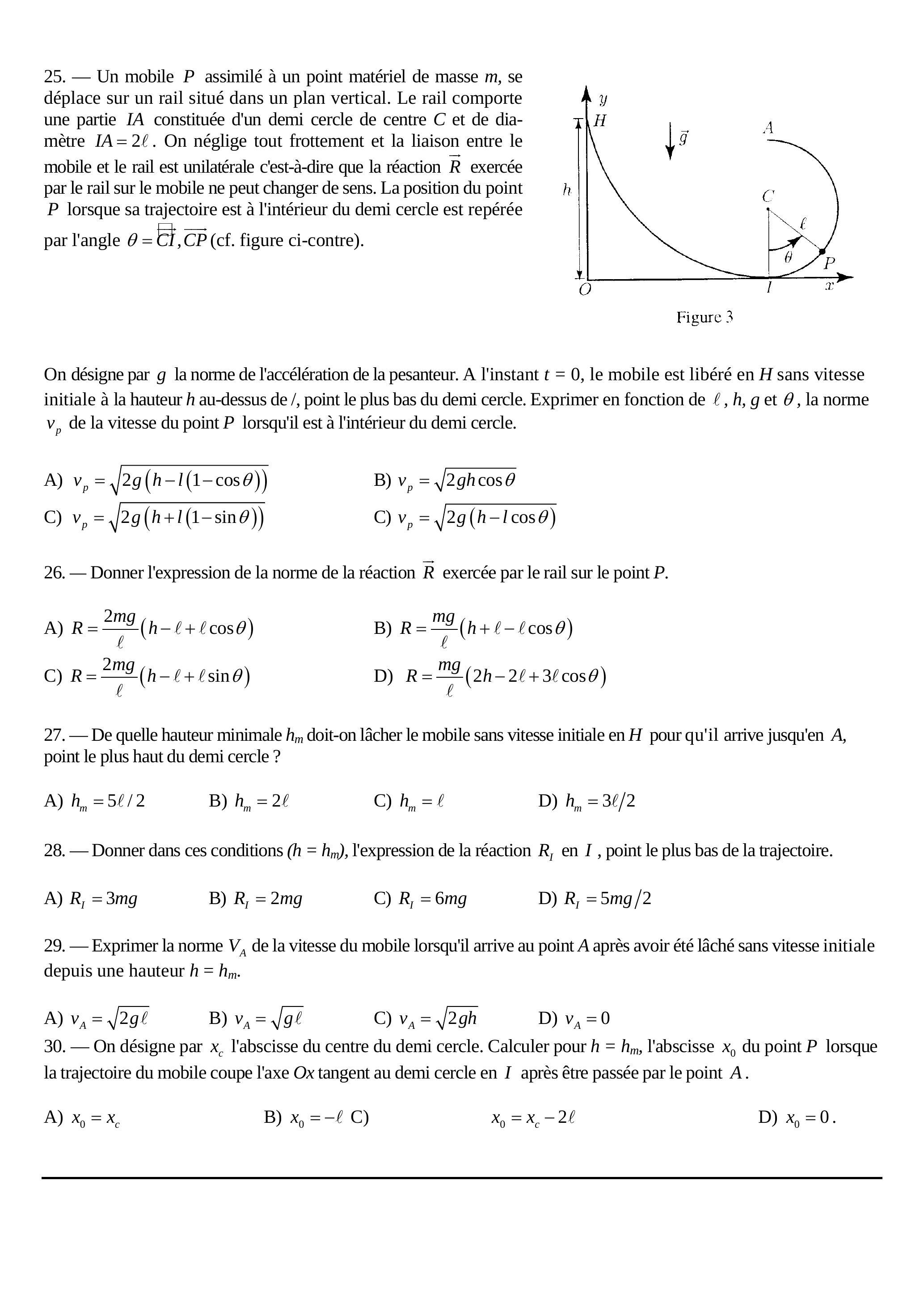 27. - De quelle hauteur minimale doit-on lâcher le mobile sans vitesse initiale en pour qu'il arrive jusqu'en , point le plus haut du demi cercle?