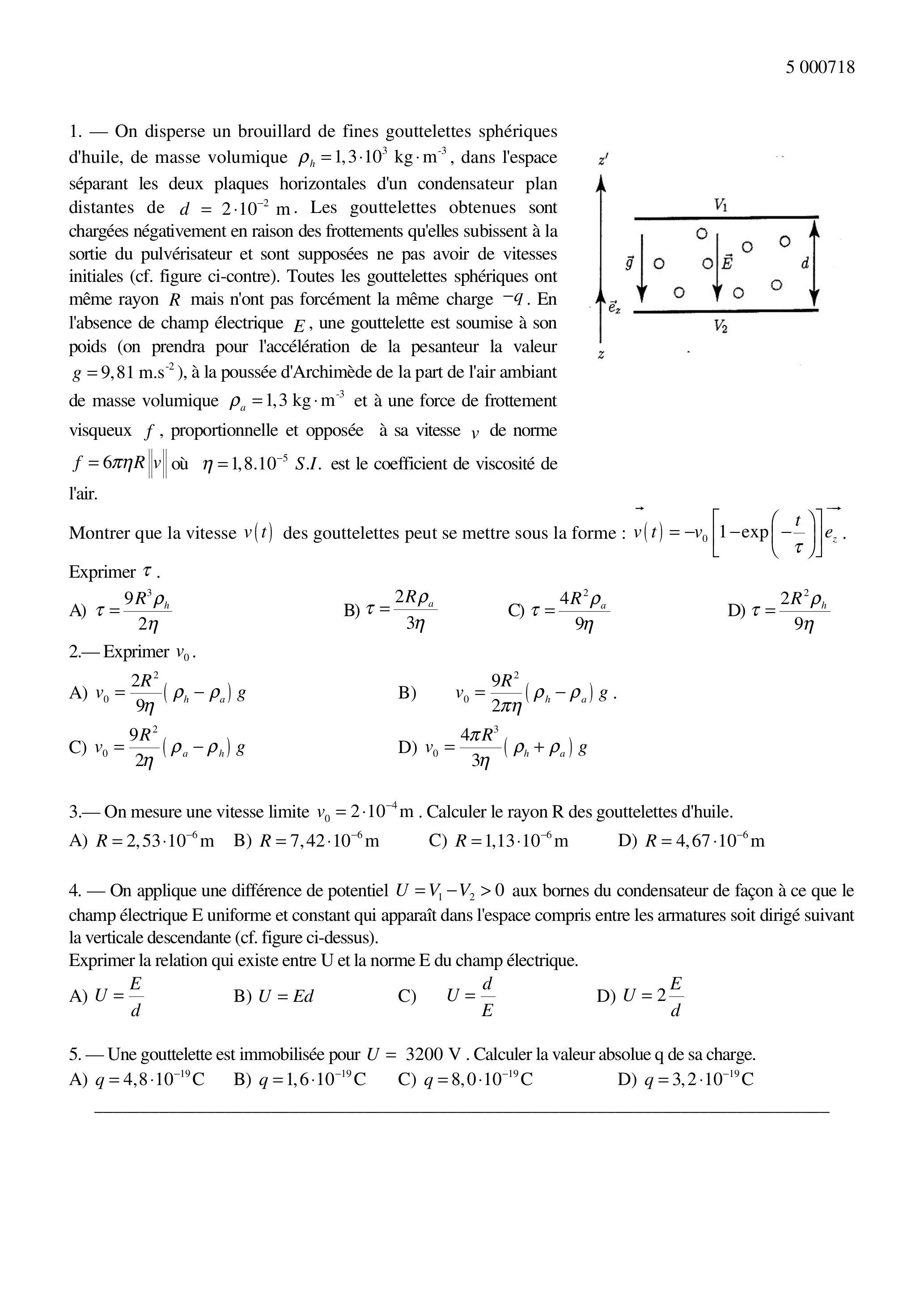 On disperse un brouillard de fines gouttelettes sphériques d'huile, de masse volumique , dans l'espace séparant les deux plaques horizontales d'un condensateur plan distantes de . Les gouttelettes obtenues sont chargées négativement en raison des frottements qu'elles subissent à la sortie du pulvérisateur et sont supposées ne pas avoir de vitesses initiales (cf. figure ci-contre). Toutes les gouttelettes sphériques ont même rayon mais n'ont pas forcément la même charge . En l'absence de champ électrique , une gouttelette est soumise à son poids (on prendra pour l'accélération de la pesanteur la valeur ), à la poussée d'Archimède de la part de l'air ambiant de masse volumique et à une force de frottement visqueux , proportionnelle et opposée à sa vitesse de norme où S.I. est le coefficient de viscosité de l'air.