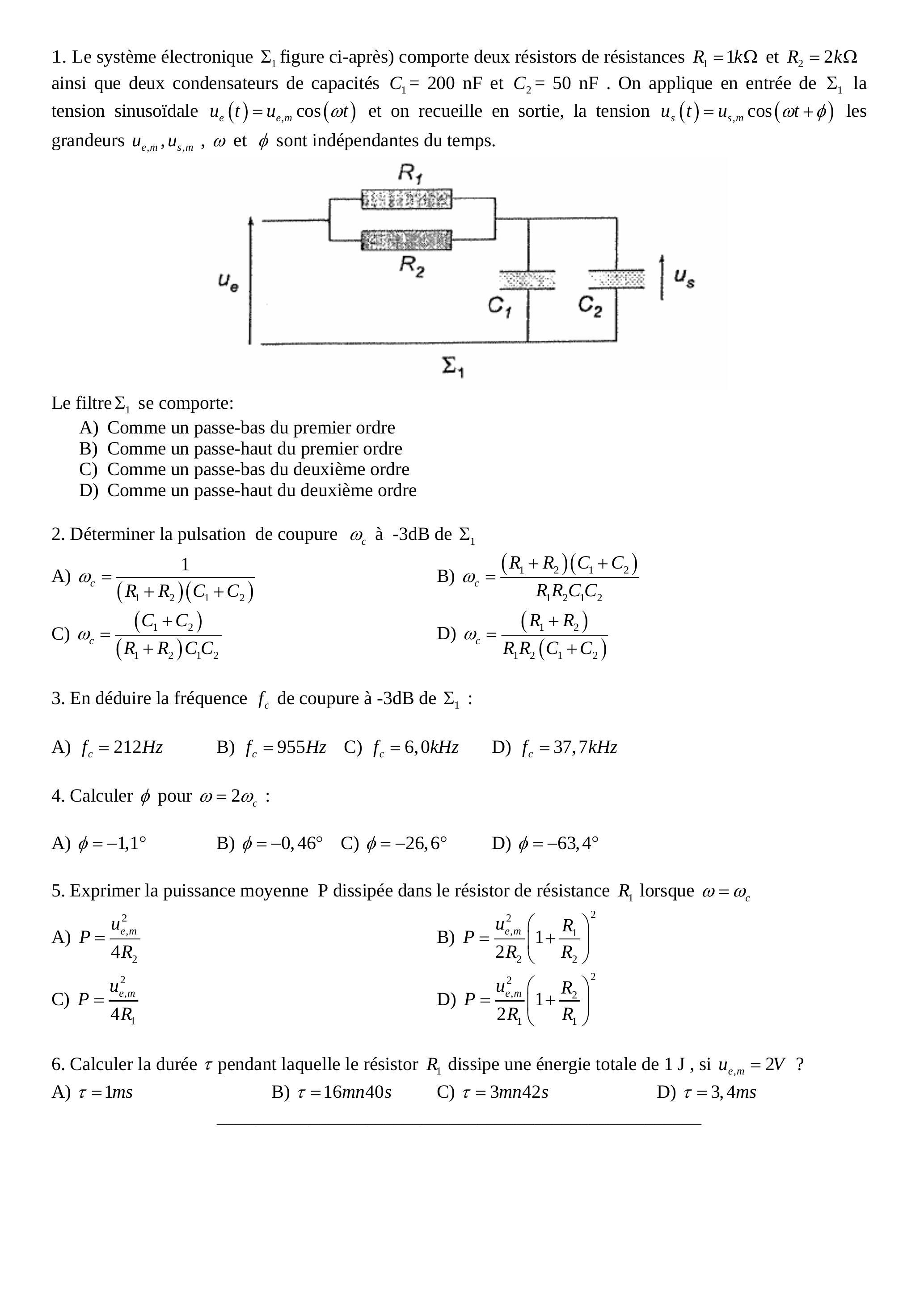 Le système électronique figure ci-après) comporte deux résistors de résistances et ainsi que deux condensateurs de capacités et . On applique en entrée de la tension sinusoïdale et on recueille en sortie, la tension les grandeurs et sont indépendantes du temps.
