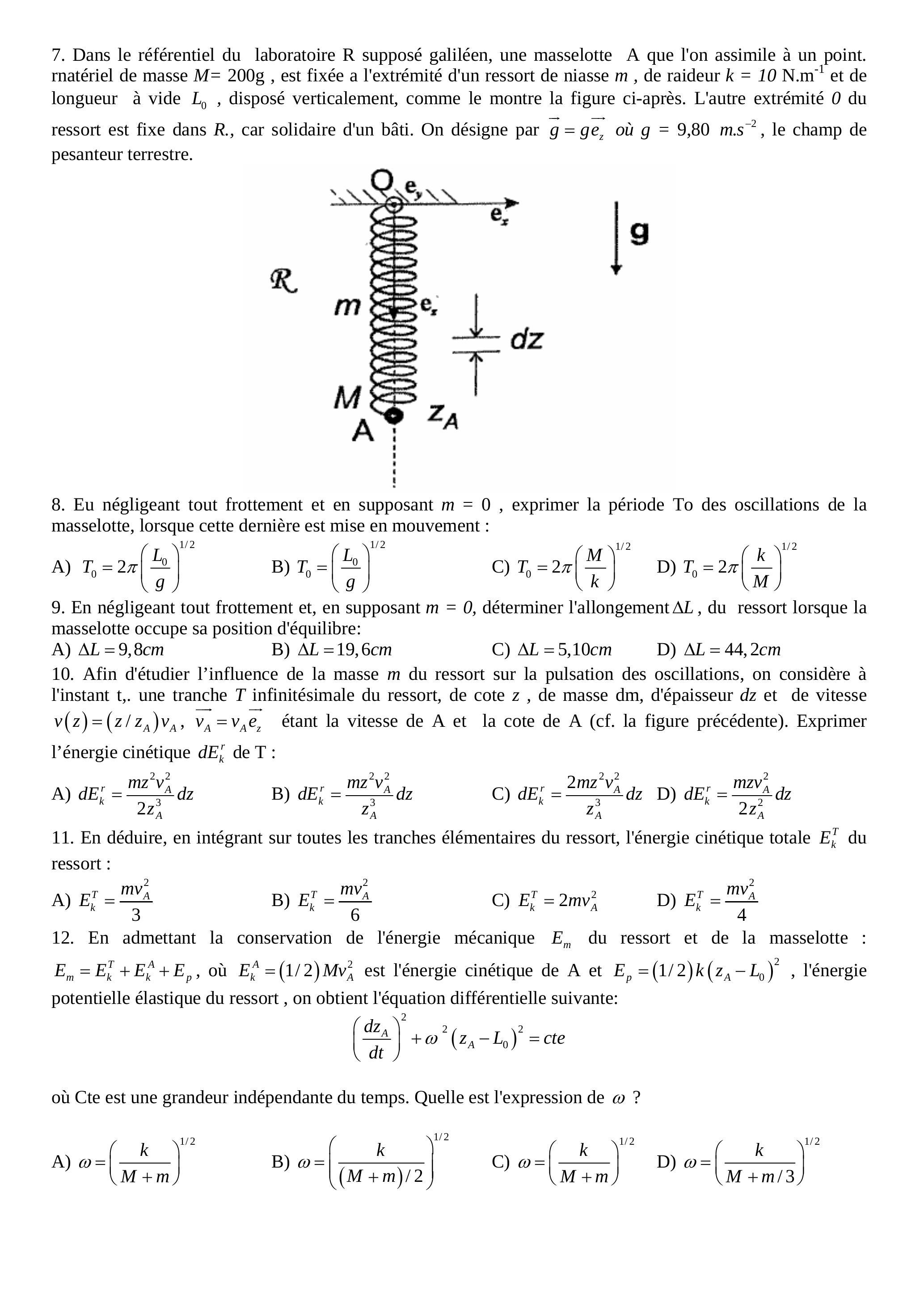 7. Dans le référentiel du laboratoire R supposé galiléen, une masselotte A que l'on assimile à un point. rnatériel de masse , est fixée a l'extrémité d'un ressort de niasse , de raideur et de longueur à vide , disposé verticalement, comme le montre la figure ci-après. L'autre extrémité 0 du ressort est fixe dans ., car solidaire d'un bâti. On désigne par où , le champ de pesanteur terrestre.