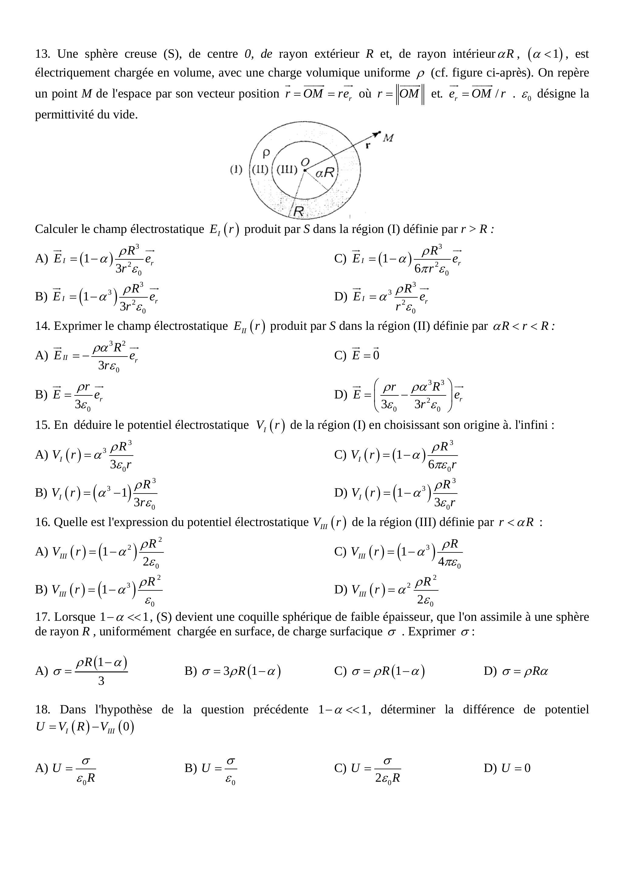 17. Lorsque , ( S ) devient une coquille sphérique de faible épaisseur, que l'on assimile à une sphère de rayon , uniformément chargée en surface, de charge surfacique . Exprimer :