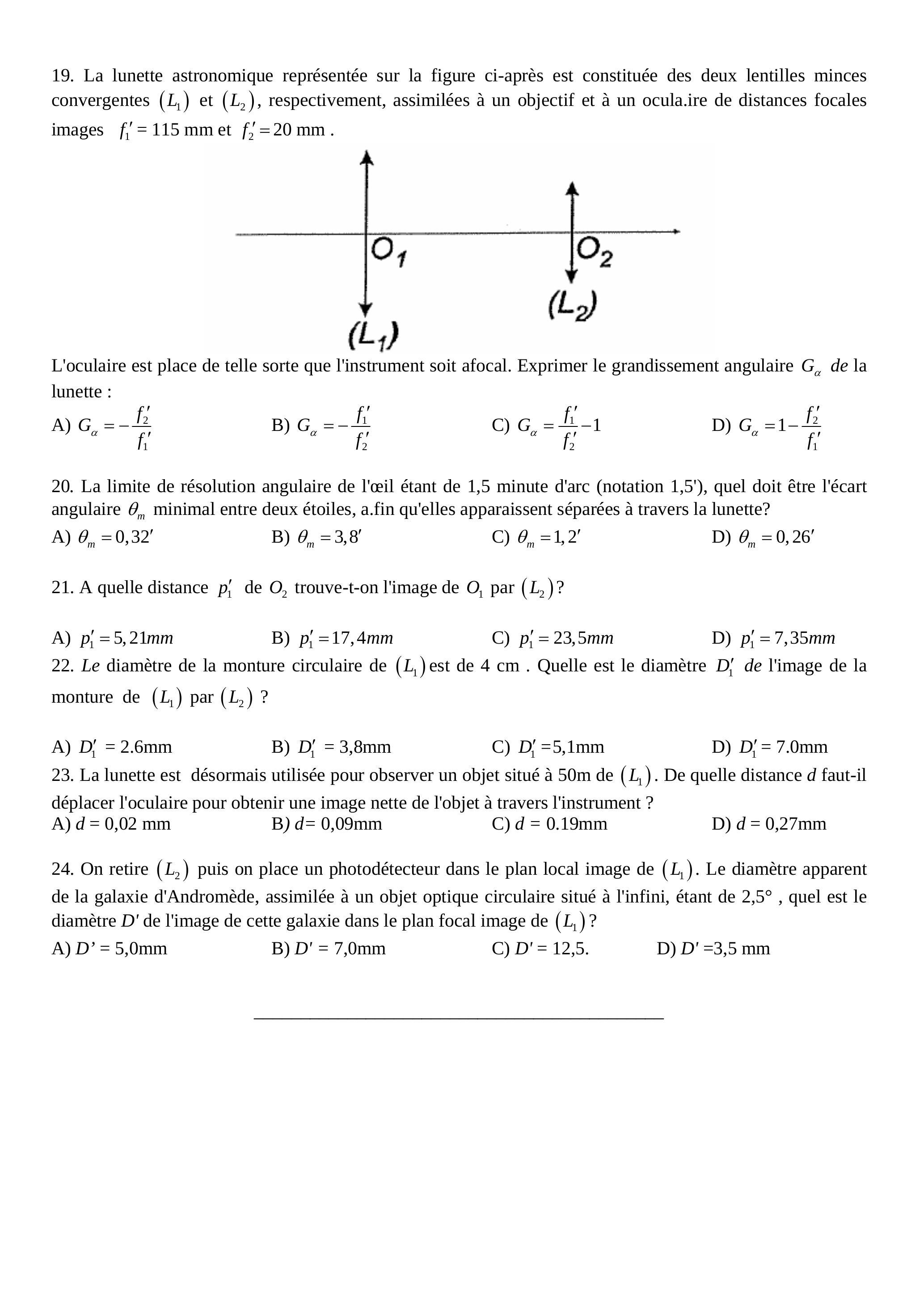 19. La lunette astronomique représentée sur la figure ci-après est constituée des deux lentilles minces convergentes ( ) et ( ), respectivement, assimilées à un objectif et à un ocula.ire de distances focales images et .