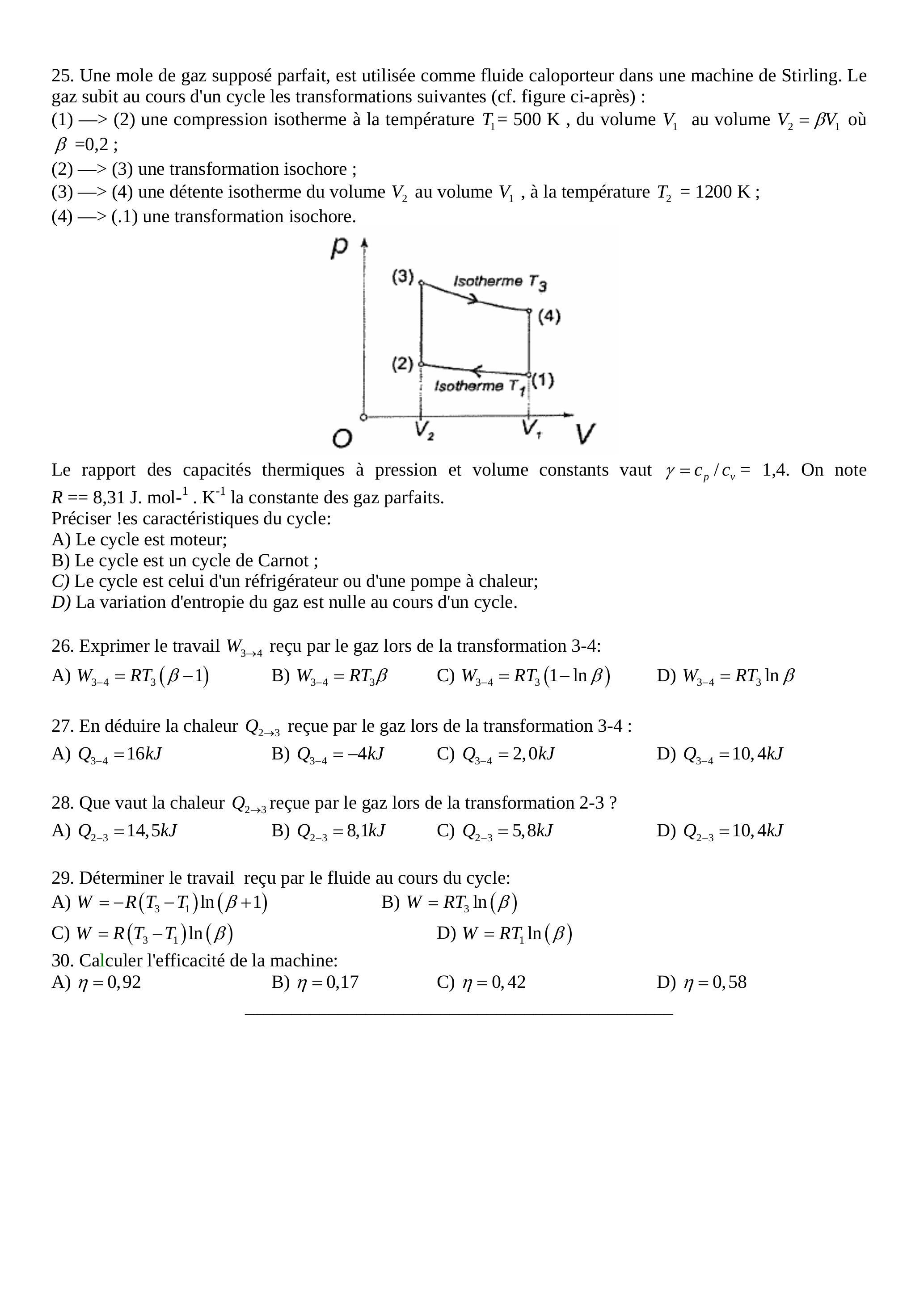 25. Une mole de gaz supposé parfait, est utilisée comme fluide caloporteur dans une machine de Stirling. Le gaz subit au cours d'un cycle les transformations suivantes (cf. figure ci-après) :