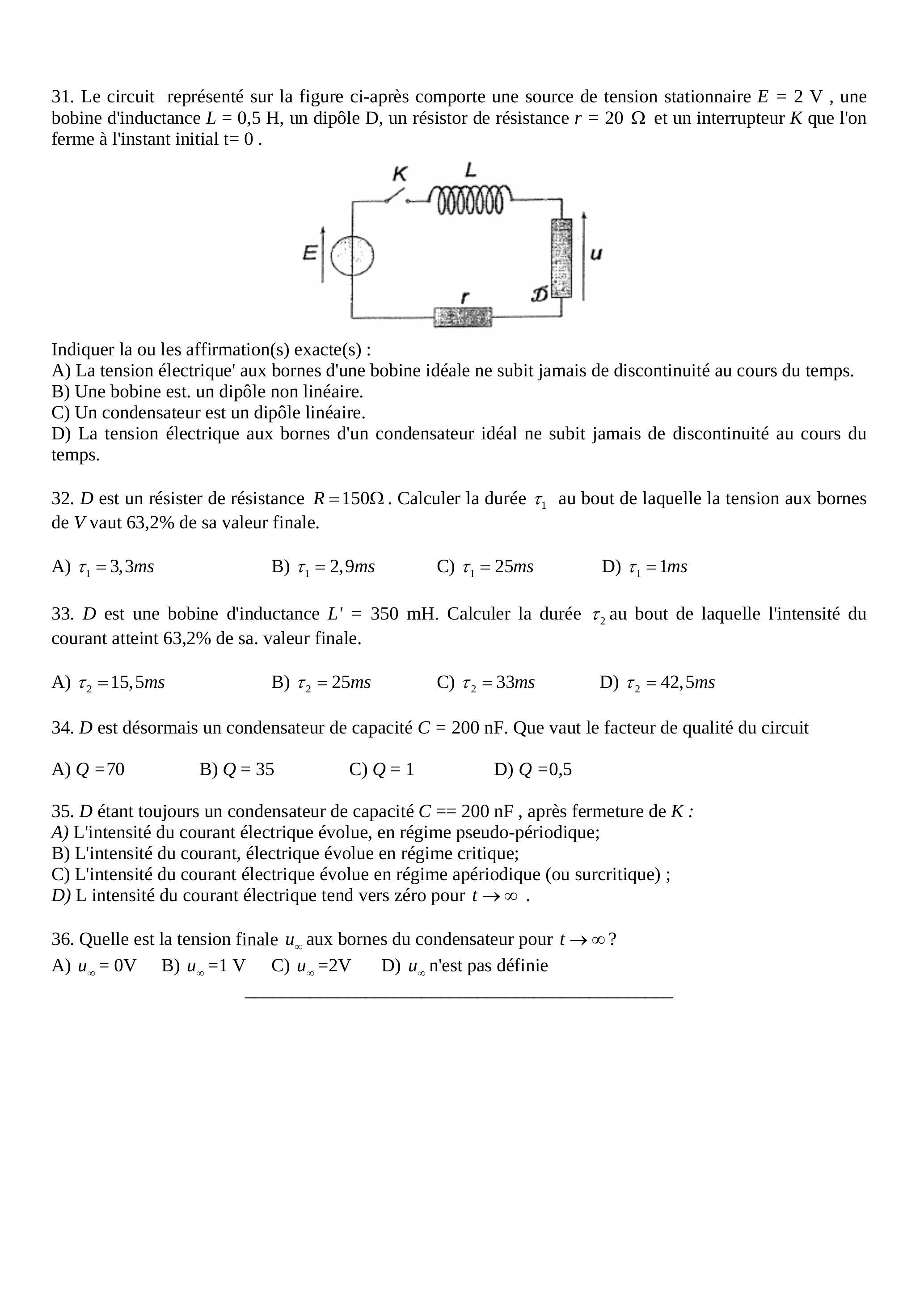 31. Le circuit représenté sur la figure ci-après comporte une source de tension stationnaire , une bobine d'inductance , un dipôle D , un résistor de résistance et un interrupteur que l'on ferme à l'instant initial .