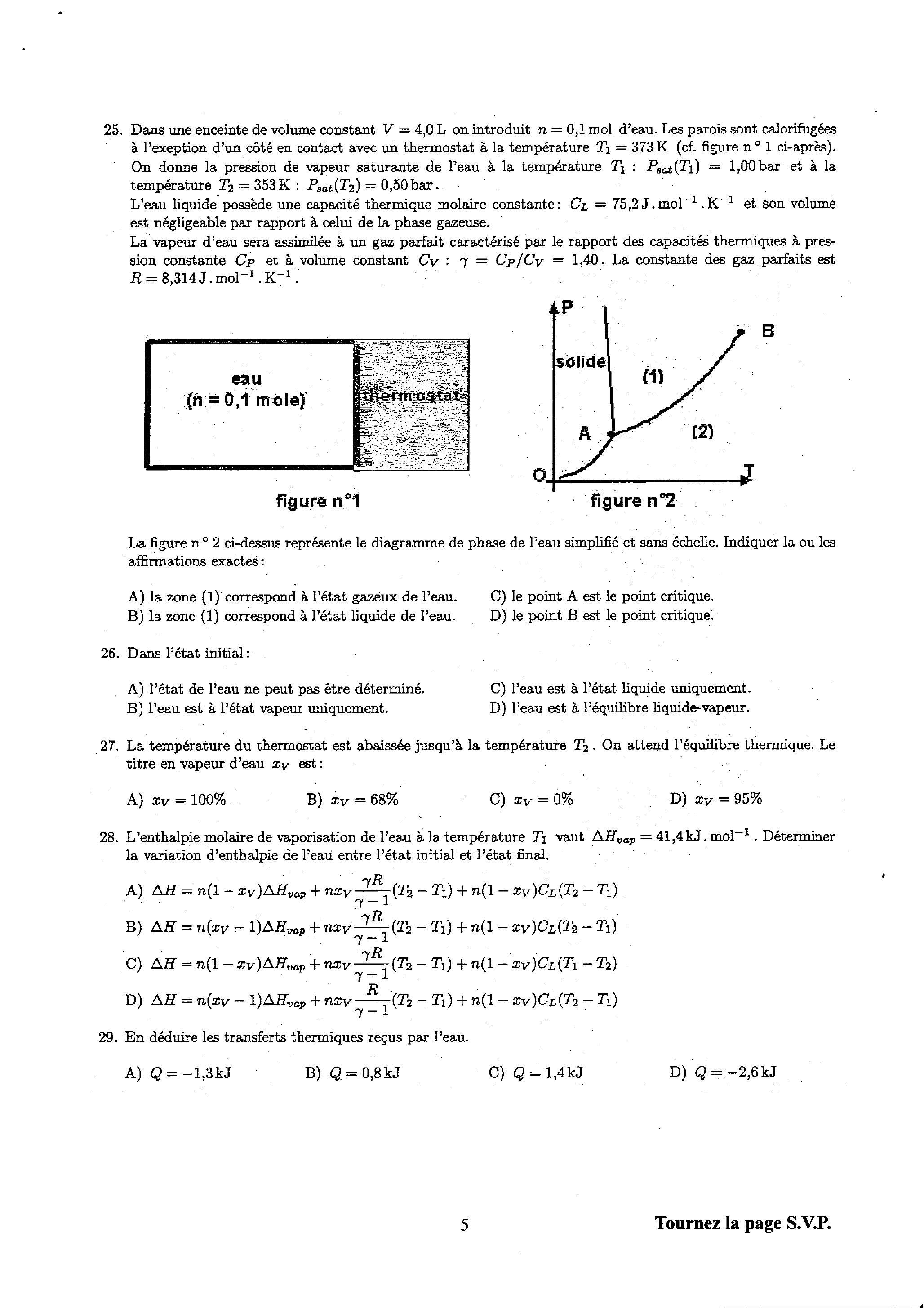 25. Dans une enceinte de volume constant on introduit d'eau. Les parois sont calorifugées à l'exeption d'un côté en contact avec un thermostat à la température (cf. figure ci-après). On donne la pression de vapeur saturante de l'eau à la température bar et à la température .