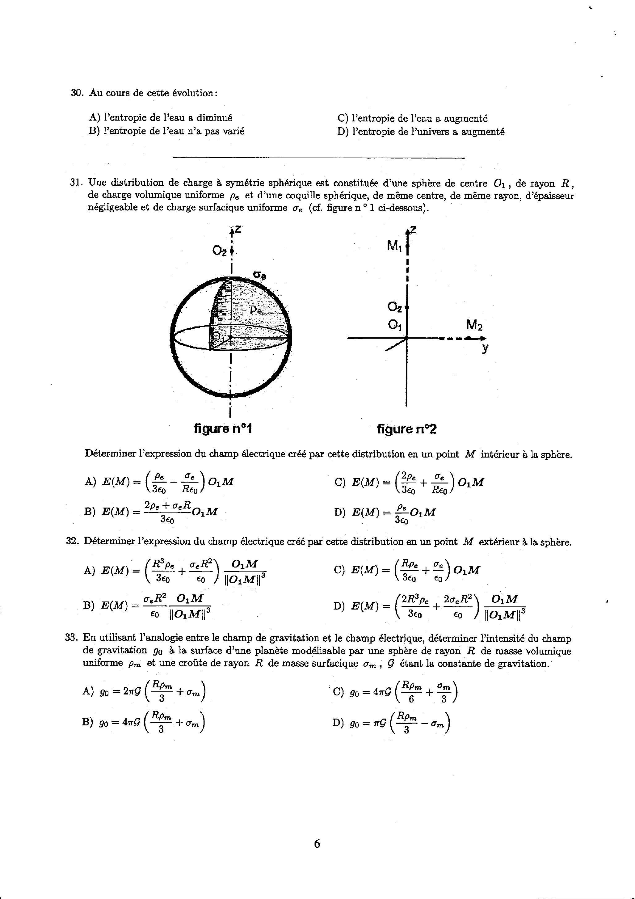33. En utilisant l'analogie entre le champ de gravitation et le champ électrique, déterminer l'intensité du champ de gravitation à la surface d'une planète modélisable par une sphère de rayon de masse volumique uniforme et une croûte de rayon de masse surfacique étant la constante de gravitation.