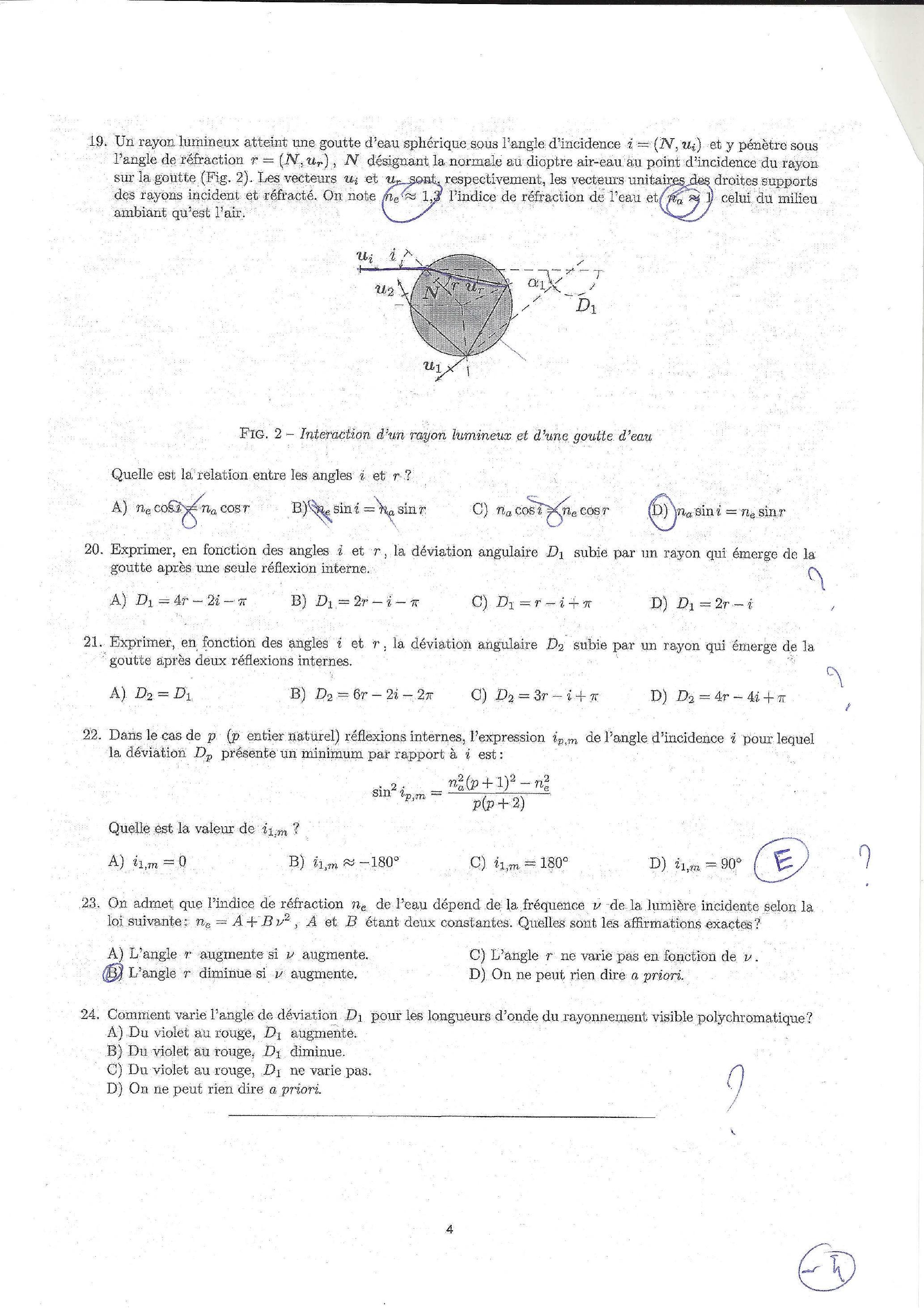 20. Exprimer, en fonction des angles et , la déviation angulaire subte par un rayon qui émerge de la goutte après une seule réflexion interne.