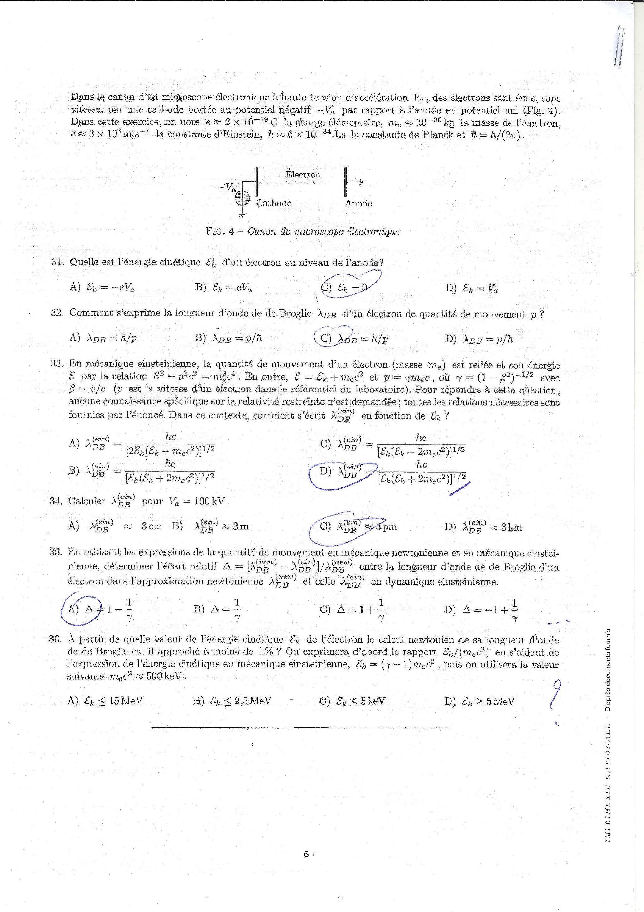 Dans le canon d'un microscope électronique à haute tension d'accélération . des électrons sont émis, sans vitesse, par une cathode portée au potentiel négatif - par rapport à lanode au potentiel nul (Fig. 4). Dans cette exercice, on note la charge élémentaire, la masse de lélectron, la constante d'Einstein, J.s la constante de Planck et .
