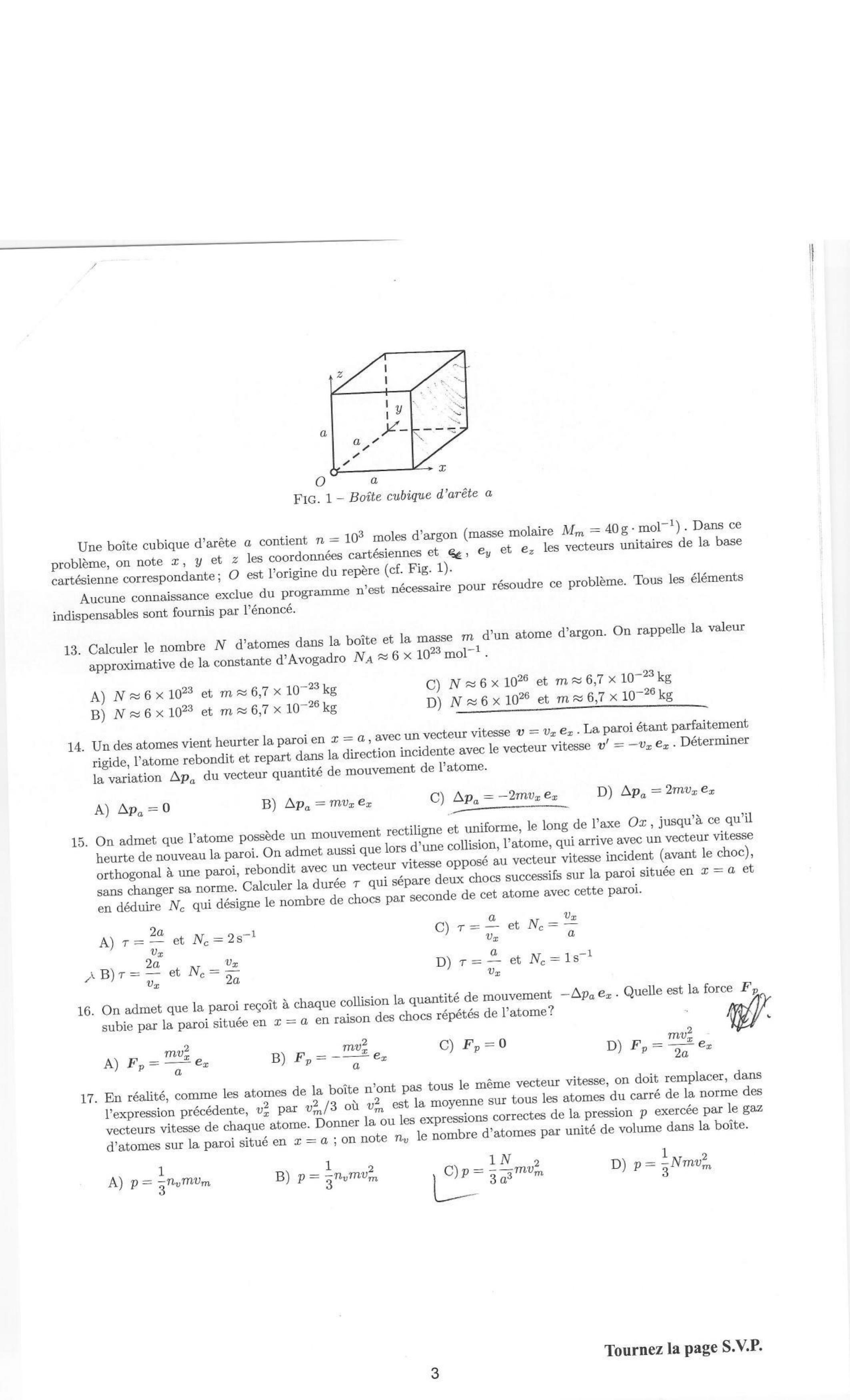 17. En réalité, comme les atomes de la boîte n'ont pas tous le même vecteur vitesse, on doit remplacer, dans l'expression précédente, par est la moyenne sur tous les atomes du carré de la norme des vecteurs vitesse de chaque atome. Donner la ou les expressions correctes de la pression exercée par le gaz d'atomes sur la paroi situé en ; on note le nombre d'atomes par unité de volume dans la boîte.