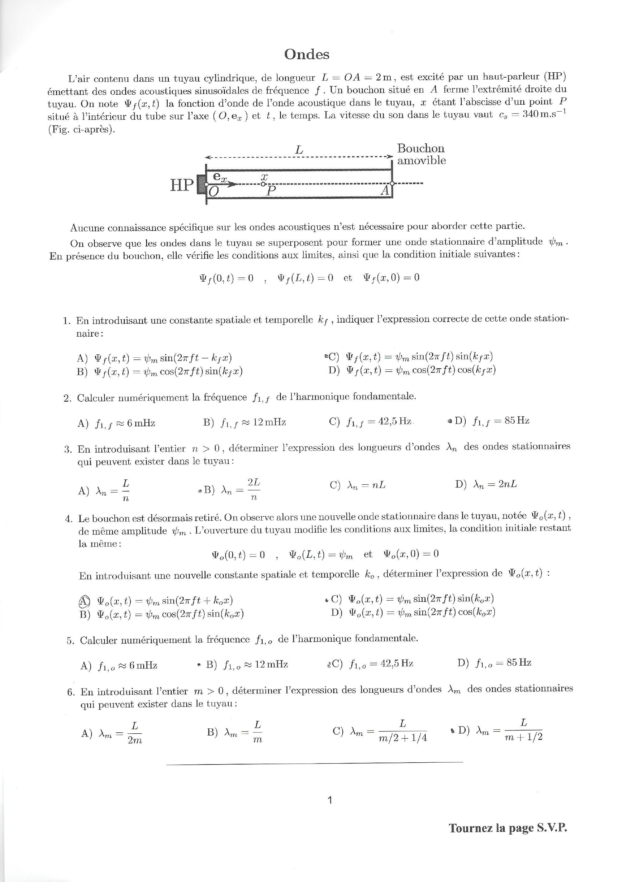 L'air contenu dans un tuyau cylindrique, de longueur , est excité par un haut-parleur (HP) émettant des ondes acoustiques sinusoïdales de fréquence . Un bouchon situé en ferme l'extrémité droite du tuyau. On note la fonction d'onde de l'onde acoustique dans le tuyau, étant l'abscisse d'un point situé à l'intérieur du tube sur l'axe ( ) et , le temps. La vitesse du son dans le tuyau vaut (Fig. ci-après).